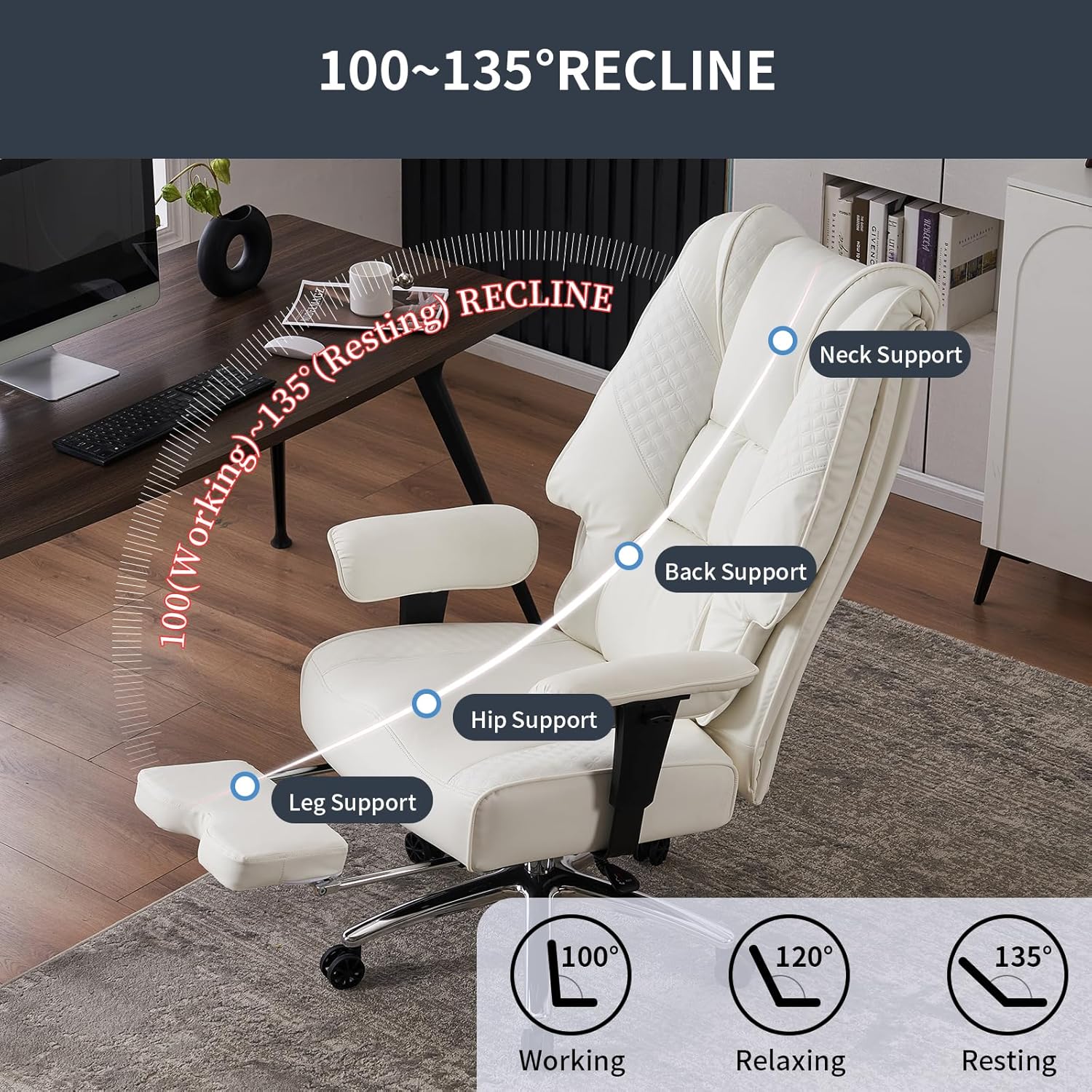 Big and Tall Office Chair 400lbs Wide Seat, Leather High Back Executive Office Chairs with Foot Rest, Ergonomic Lumbar Support for Lower Back Pain Relief (White)