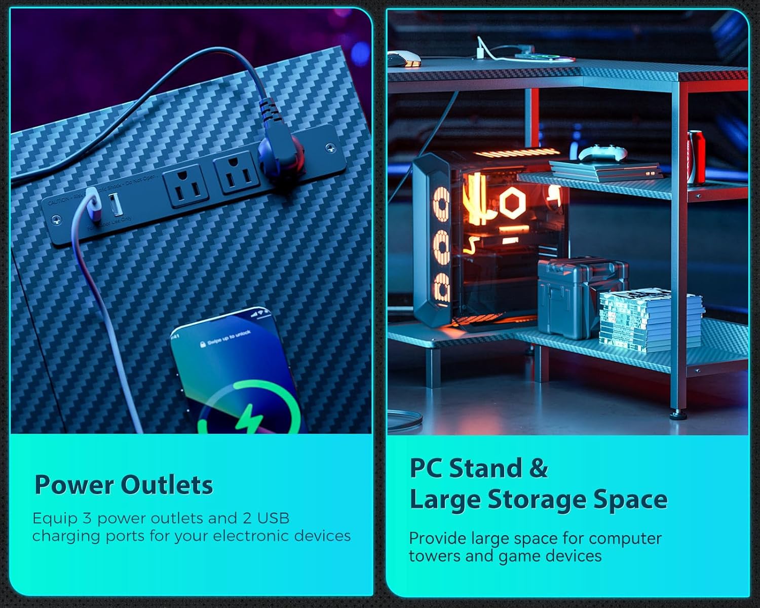 - 【Power Outlets & Charging Ports】 ODK L shaped computer desk is equipped with 3 Power outlets & 1 USB charging port & 1 Type-C port for electronic devices, you can easily and conveniently charge your smart phone, gaming gear or Bluetooth devices while you are working or playing games.