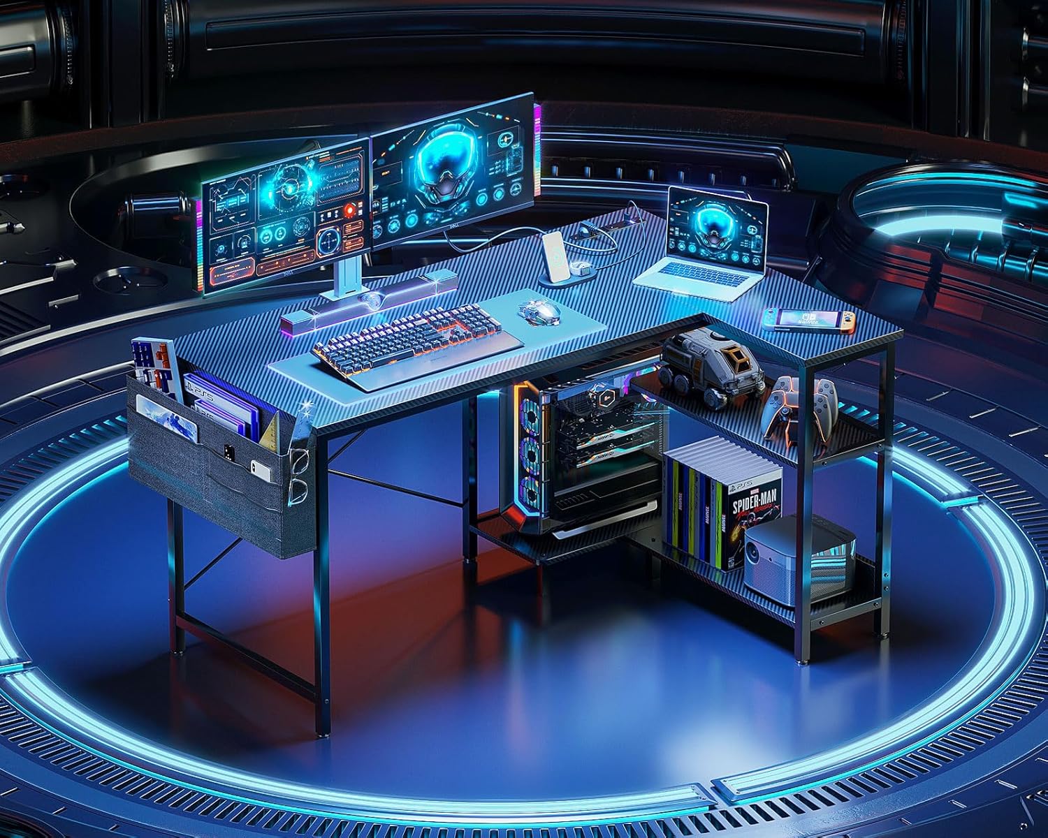 - 【Super Ample Storage Space】With Two-tier open shelves and PC stand providing maximally ample space for your PC case, books, files, devices for convenience usage, and side storage bag helps you store gaming devices or office stuffs.