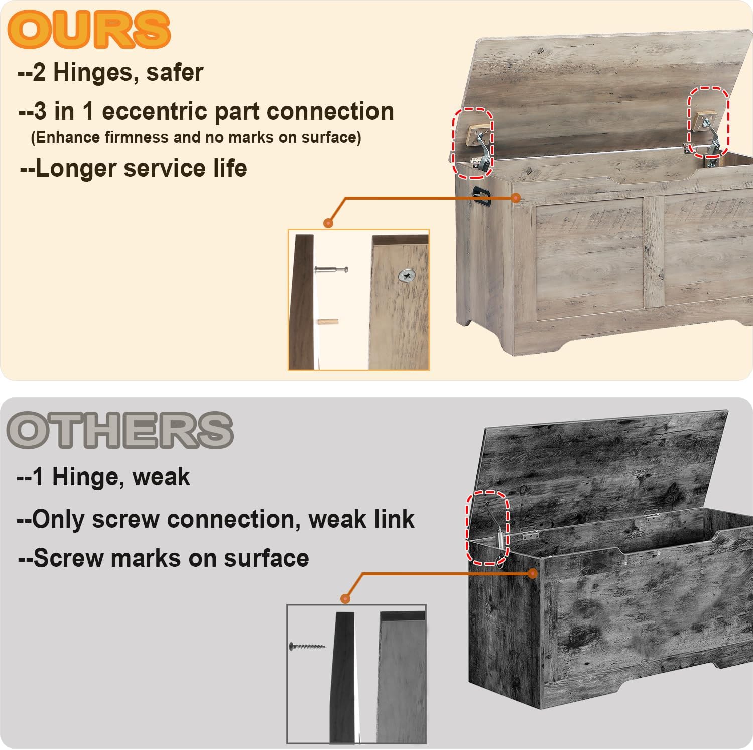 - 2 Safety Hinges- The entryway storage chest is equipped with 2 advanced safety hinges that can stop at any position, allowing you to open and close it slowly without closing suddenly and pinching your fingers. The maximum opening angle is 90°