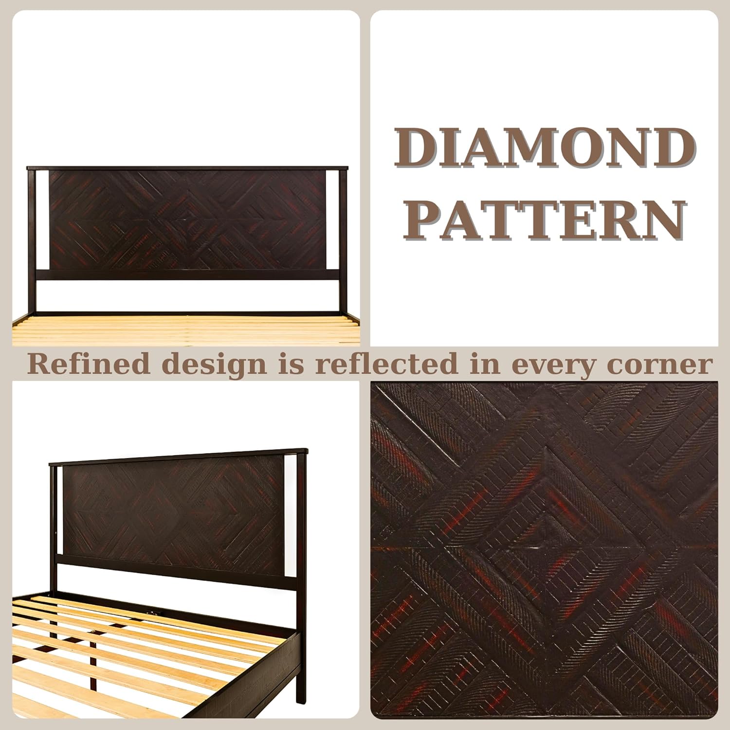 Bme Ethan King Size Bed Frame with Diamond Headboard, Rustic Mid-Century Modern, Solid Acacia Wood, No Box Spring Needed, Slat Support, Rustic Black