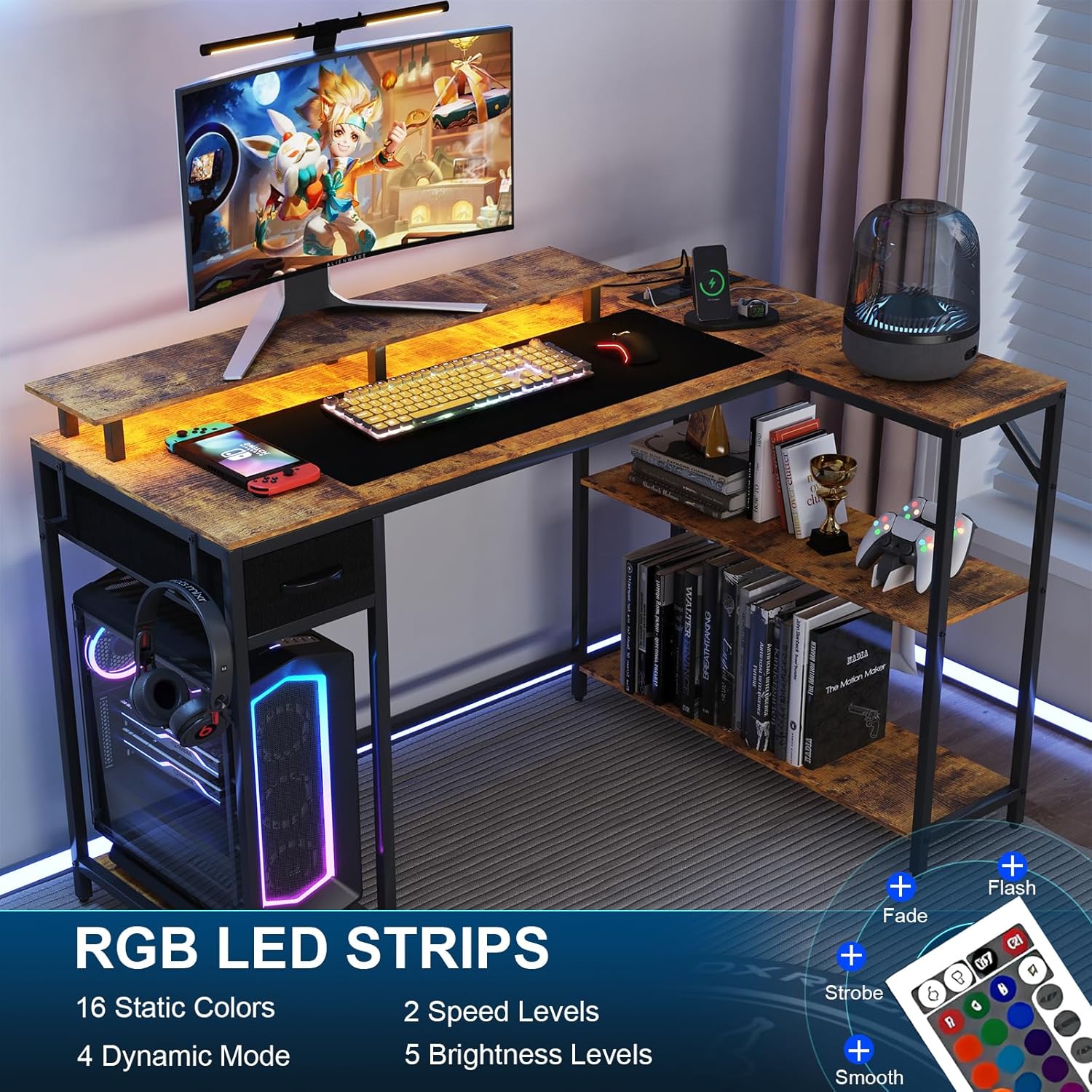 47" L Shaped Computer Desk with LED Light and Power Outlet, Reversible L Shaped Desk with Monitor Stand and Drawer, Gaming Desk with Shelves and 2 Hooks for Home Office Bedroom