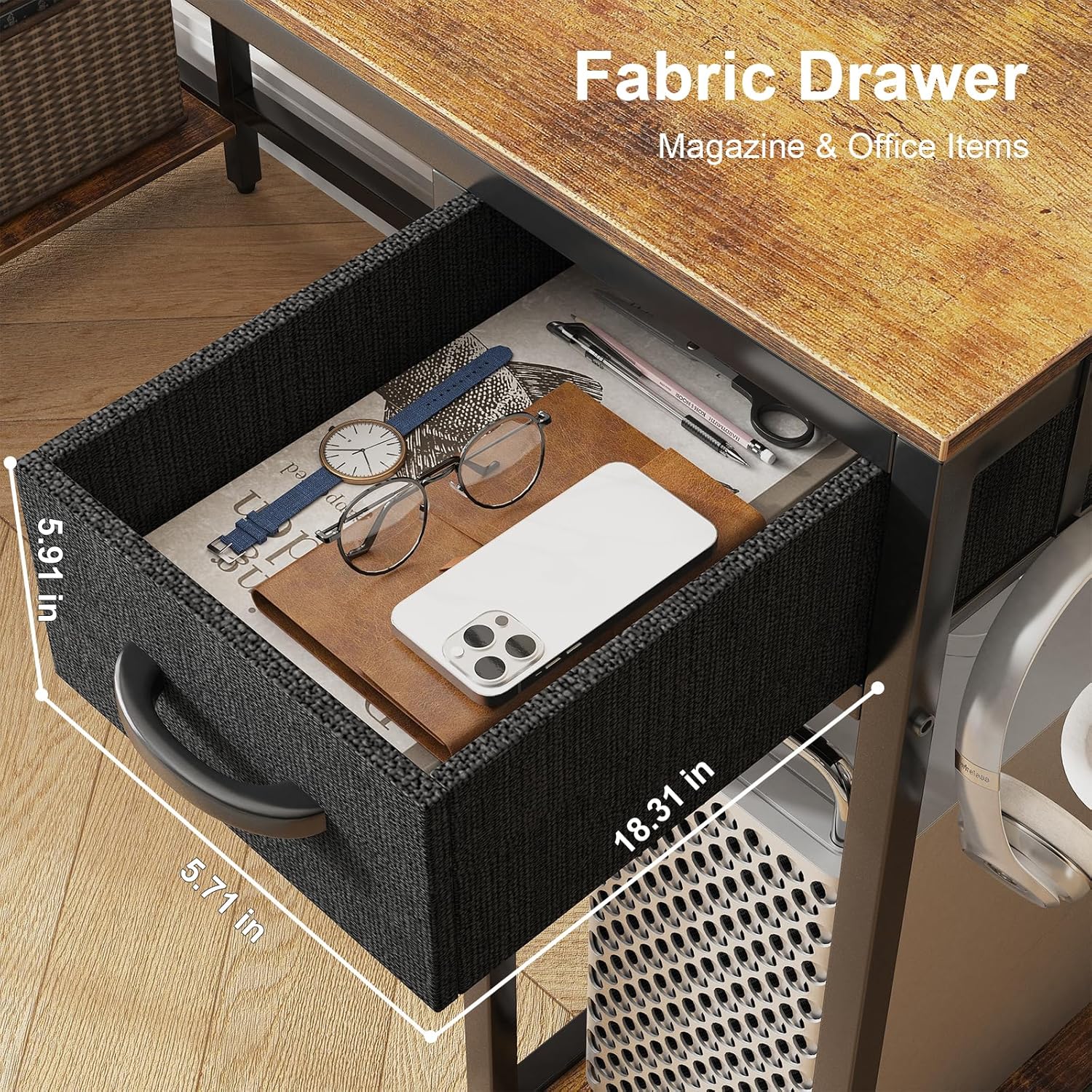 - 【L Shaped Computer Desk with Storage】: 47.2"(L) x 31.5"(W) x 29.53"(H). Lots of legroom, the desktop and two storage shelves on the side provide ample space for storing an unlimited amount of office supplies and documents. The PC tower can be conveniently placed on the bottom shelf, while a drawer is available to store stationery and other personal items, which can be used as a writing desk, study desk, or game table, designed specifically for modern home offices