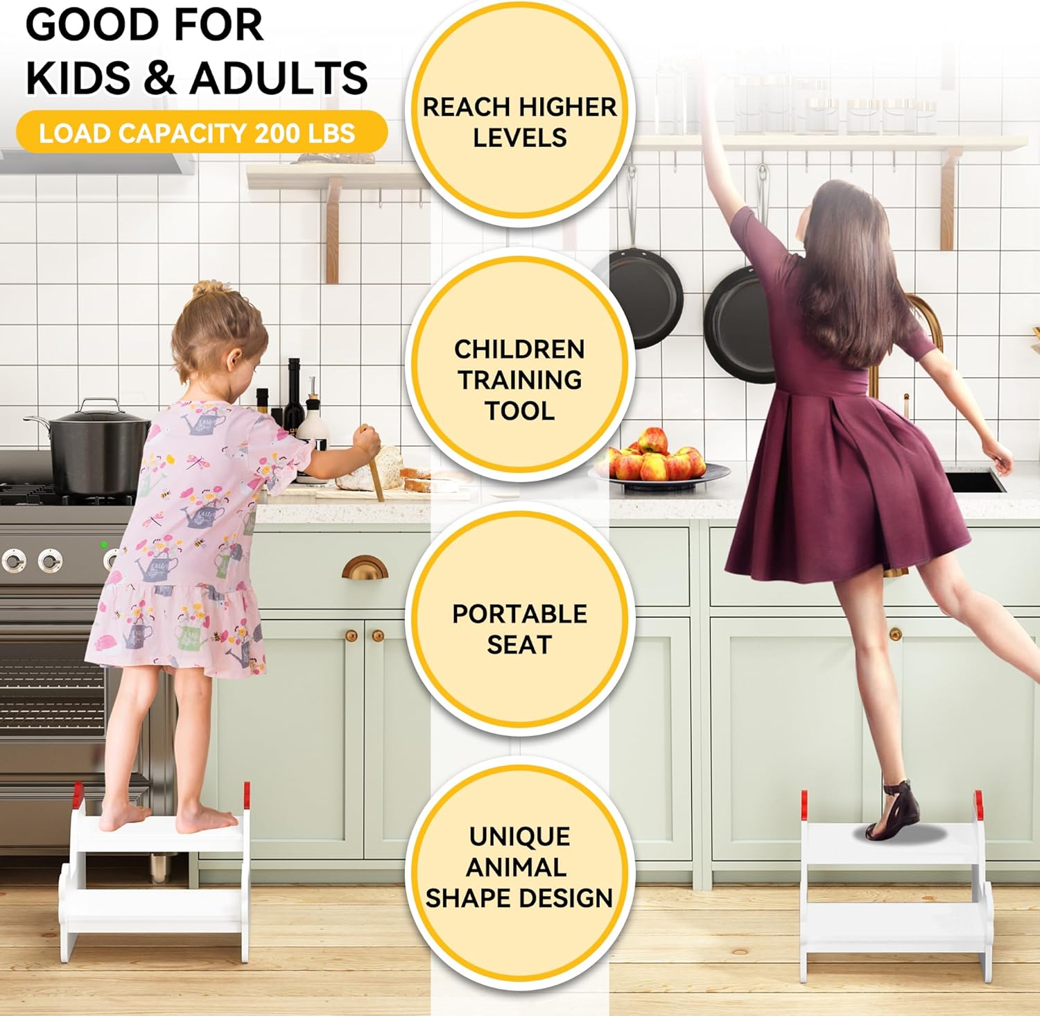 - 【Cute and Safe Design&Multipurpos Stool】The kids step stool is designed in the shape of a chick, very cute and suitable for children. Don't think that a crooked nose and a raised butt of the toddler kitchen stool are unsafe, the outer force points of our pedals are firmly placed on the nose and legs of the bathroom stool to ensure that they don't fall over. Otherwise, the multifunctional kids stool can be a toilet training stool, a plant stand, a pet steps, or a small shoes rack.