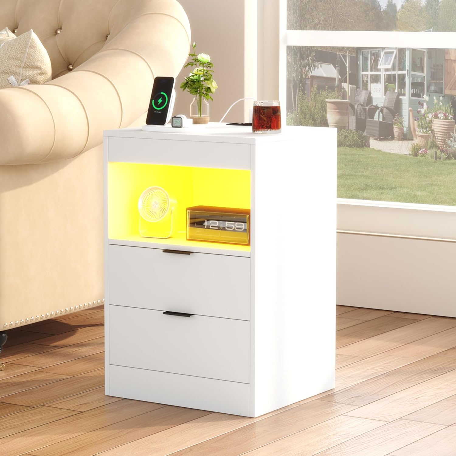 - 【Multifunctional Design】This modern nightstand is not just an ordinary drawer, but also comes with multi-colour LED Light and socket functions. You can freely set the brightness, color, mode and speed, and design your light show to your heart's content, allowing you to enjoy a more convenient and happy living experience by the bedside