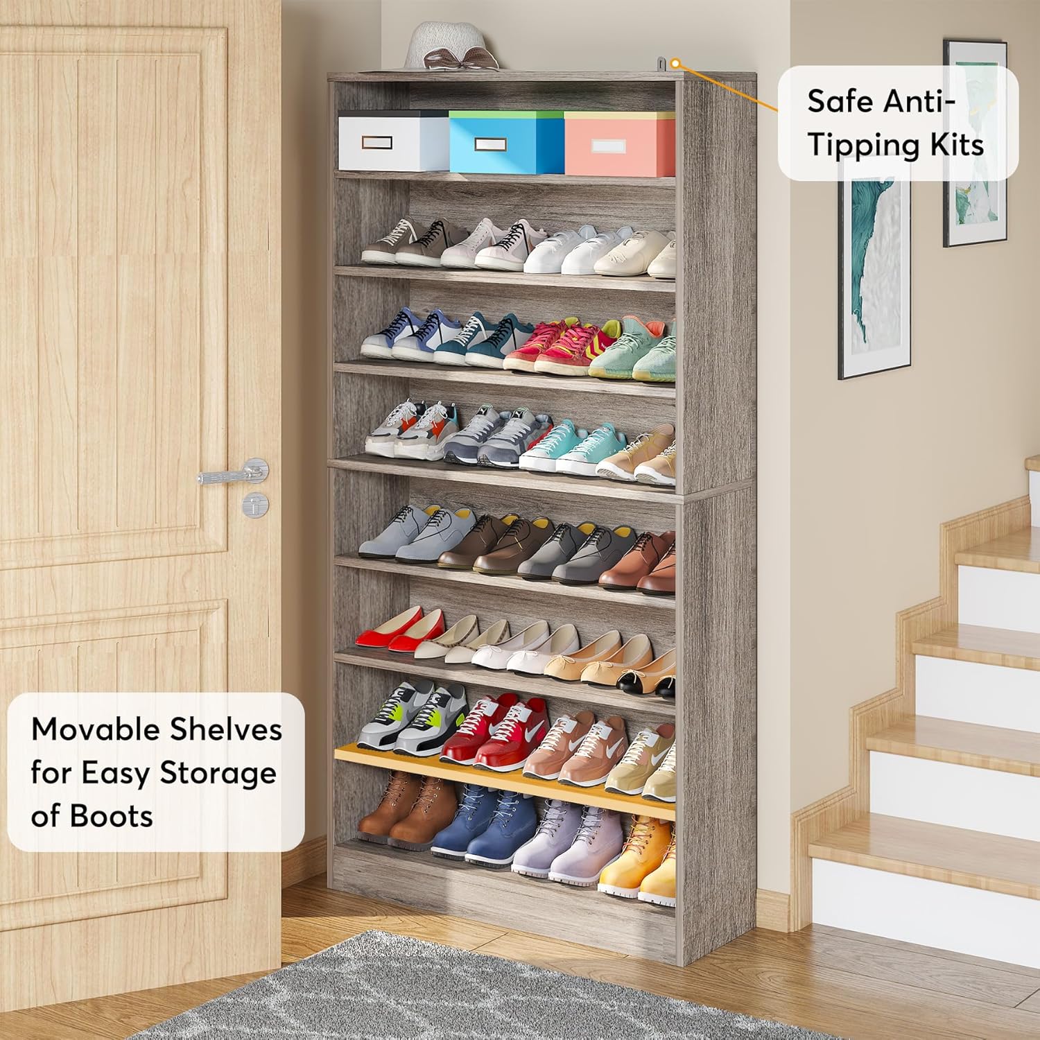 - [Complete Your Shoe Collection] Tribesigns grey shoe cabinet with quite strong storage capacity easily help you get rid of shoes clutter. This wood shoe cabinet with 8 tiers hold 32-35 pairs adult shoes or 40-45 kids shoes. It can be also used to visually display your shoe boxes collection or pairs of limited edition shoes. You can buy two to place them together and get more storage as well.