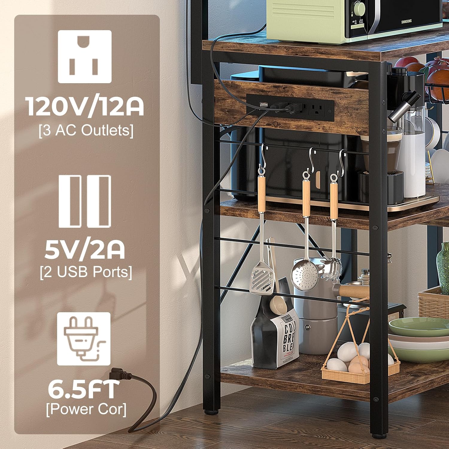 - 【Bakers Racks for Kitchens with Power Outlets】Our Bakers Rack is built in 3 AC Outlets &2 USB Ports. No need to move around your coffee makers, toaster or bread maker, easy to get charged. All for a tidy and safe kitchen space. Sockets on the side also keep the electrical cords looking neat. Brings much more convenience to your daily life.