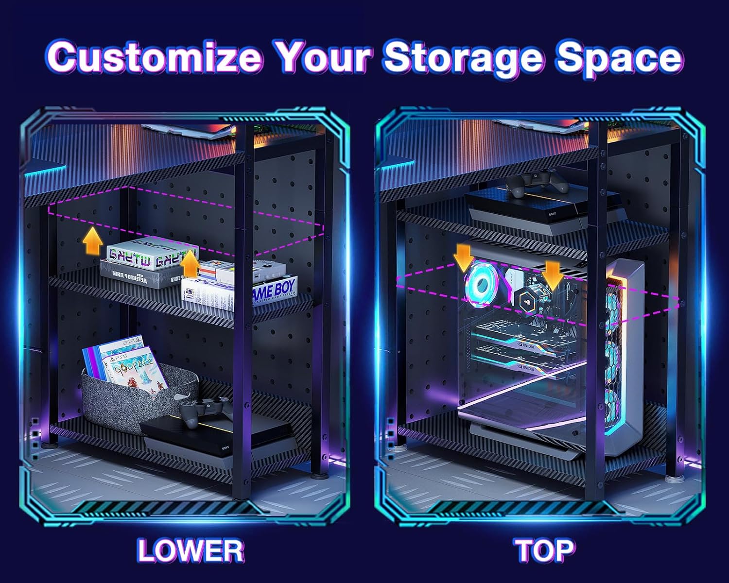 ODK Reversible Gaming Desk with Power Outlets and LED Lights, 48 Inch Computer Desk with Storage Shelves and Monitor Stand, Modern Writing Study Desk for Home Office, Carbon Fiber Black