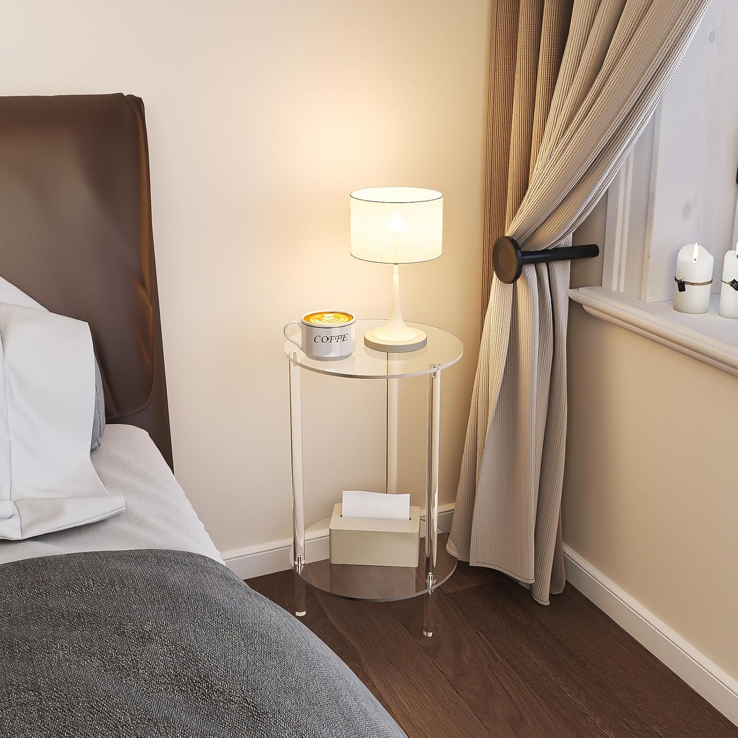 HMYHUM Acrylic Round Side Table for Small Spaces, 11.8" L x 11.8" W x 20.2" H, Small Nightstand/Bedside/End Table for Living Room, Bedroom, 2-Tier, Clear