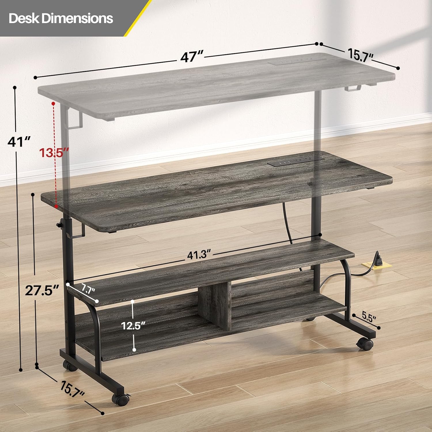 Height Adjustable Standing Desk with Power Outlets, 47" Manual Stand Up Desk with Storage Shelves Small Mobile Rolling Computer Desk Portable Laptop Table with Wheels for Home Office, Grey Oak