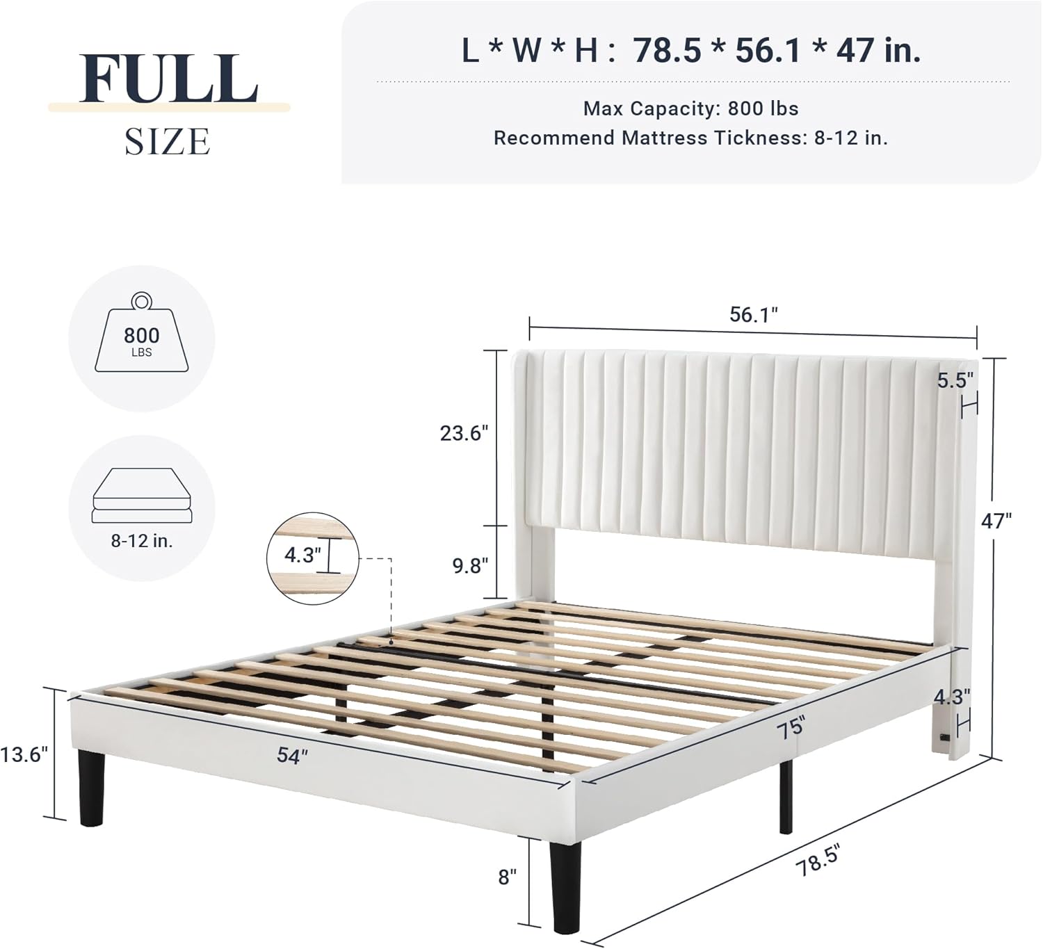 Allewie Full Size Velvet Bed Frame/Vertical Channel Tufted Wingback Headboard/Upholstered Platform Bed/Strong Wooden Slats/No Box Spring Needed/Easy Assembly/White
