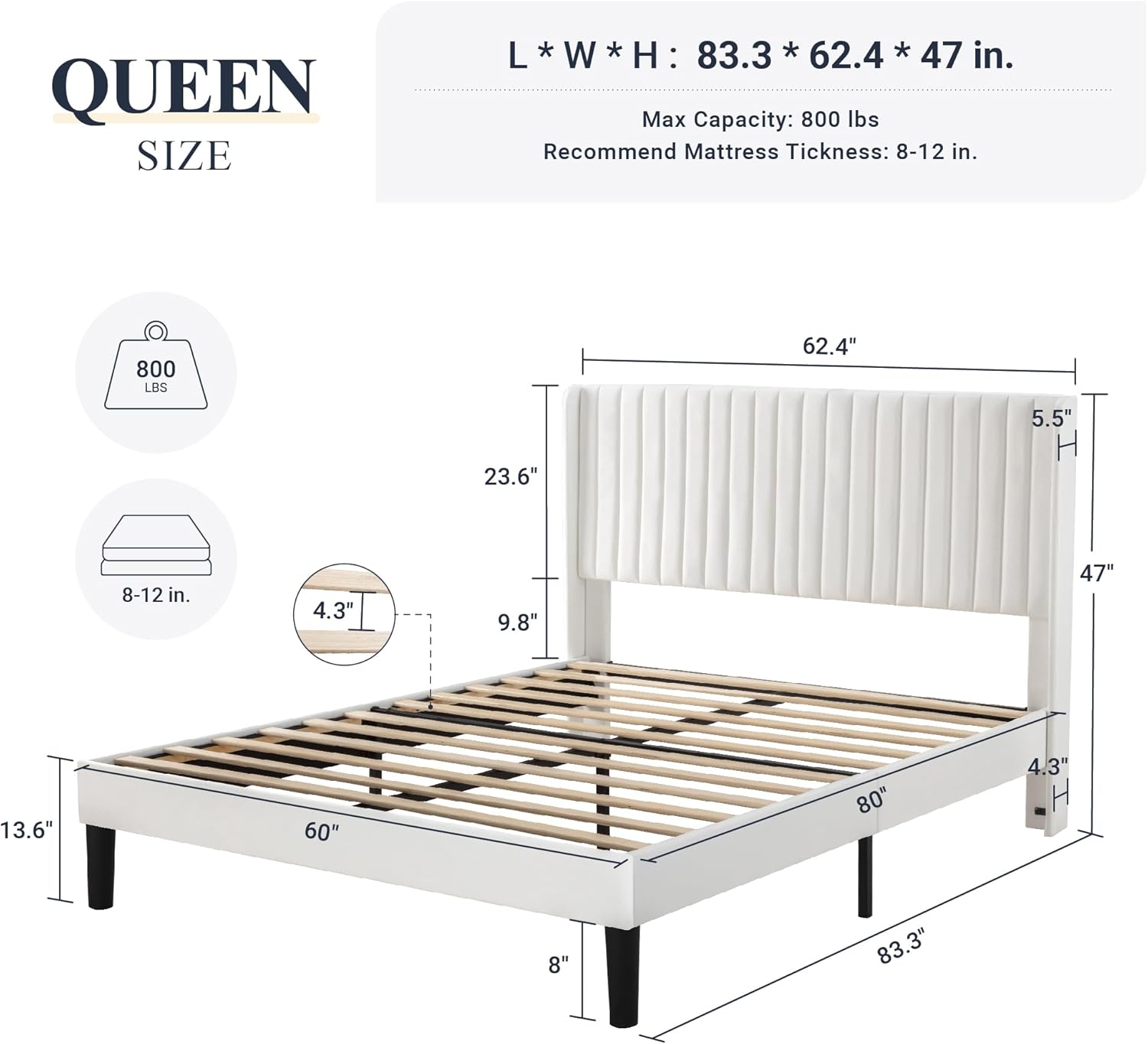 Allewie Queen Size Velvet Bed Frame/Vertical Channel Tufted Wingback Headboard/Upholstered Platform Bed/Strong Wooden Slats/No Box Spring Needed/Easy Assembly/White