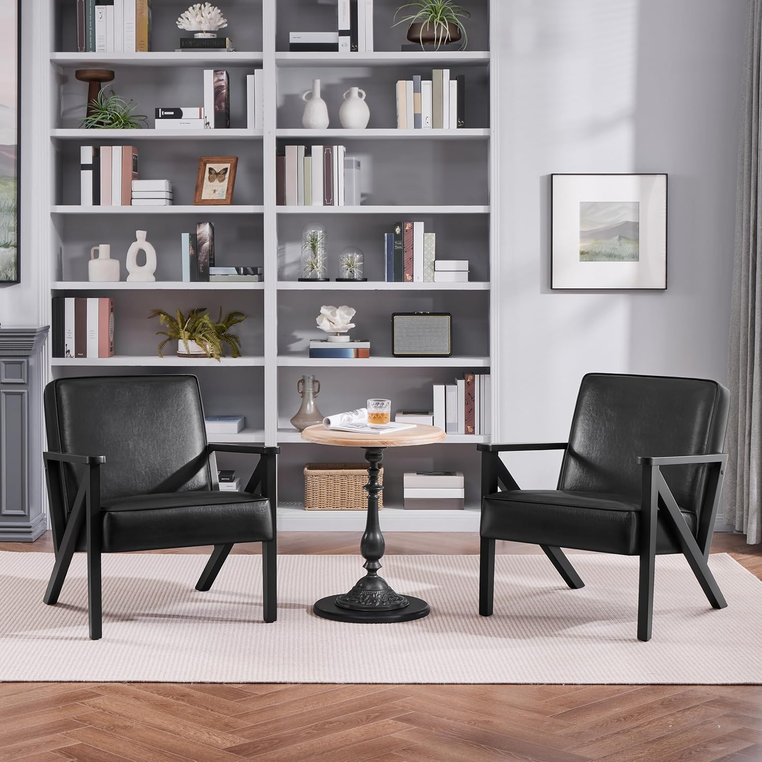 Yaheetech Accent Chair, PU Leather Reading Chair, Mid Century Modern Arm Chair with Solid Wood Frame for Living Room Bedroom Waiting Room, 2 Pieces, Black