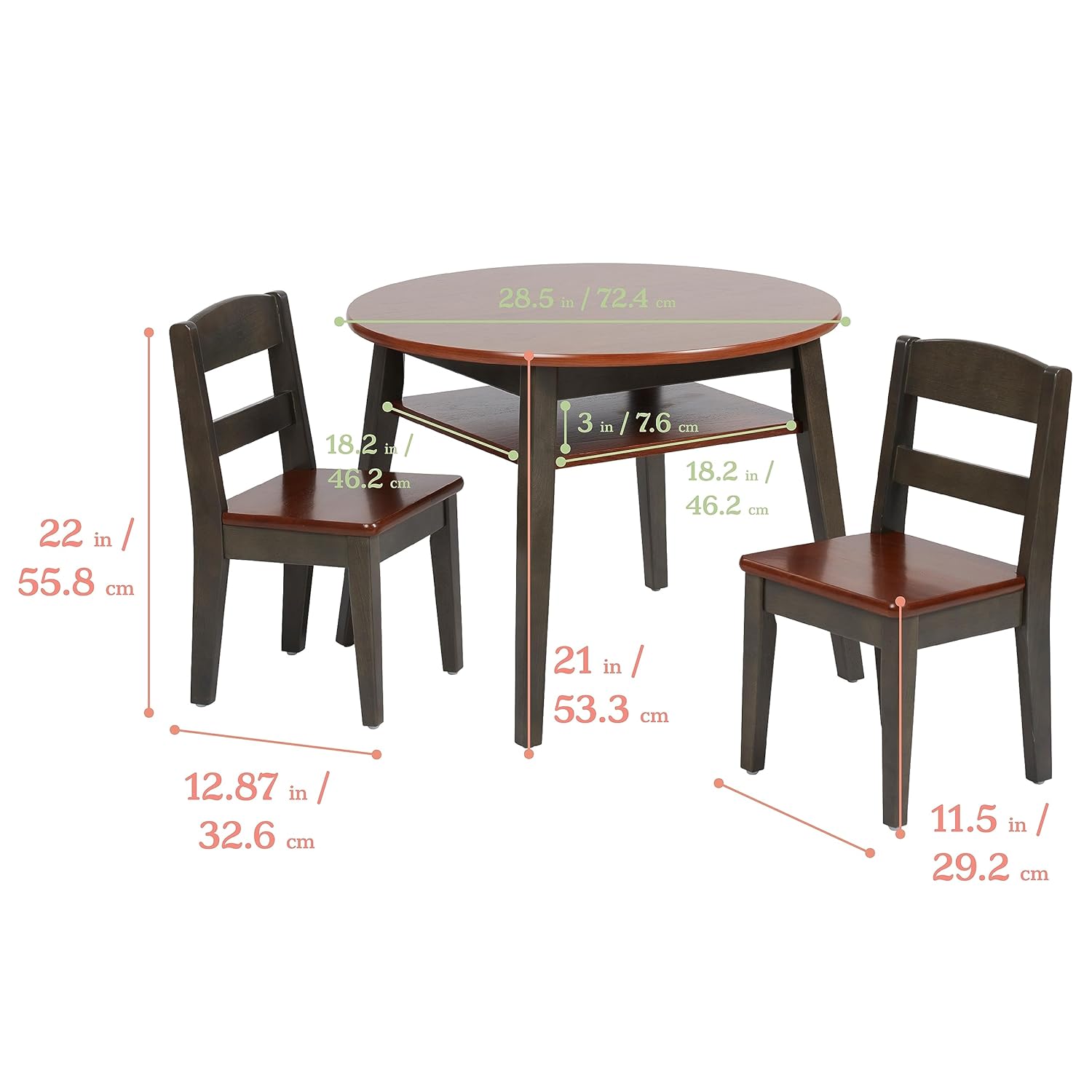 - Product Dimensions: Table 28.5" W x 28.5” D x 21” H; storage shelf 18.2” W x 18.2” D x 3” H; chair 12" W x 12.87" D x 22" H, seat height is 11.5” H; Adult Active Engaged & Direct Supervision Required