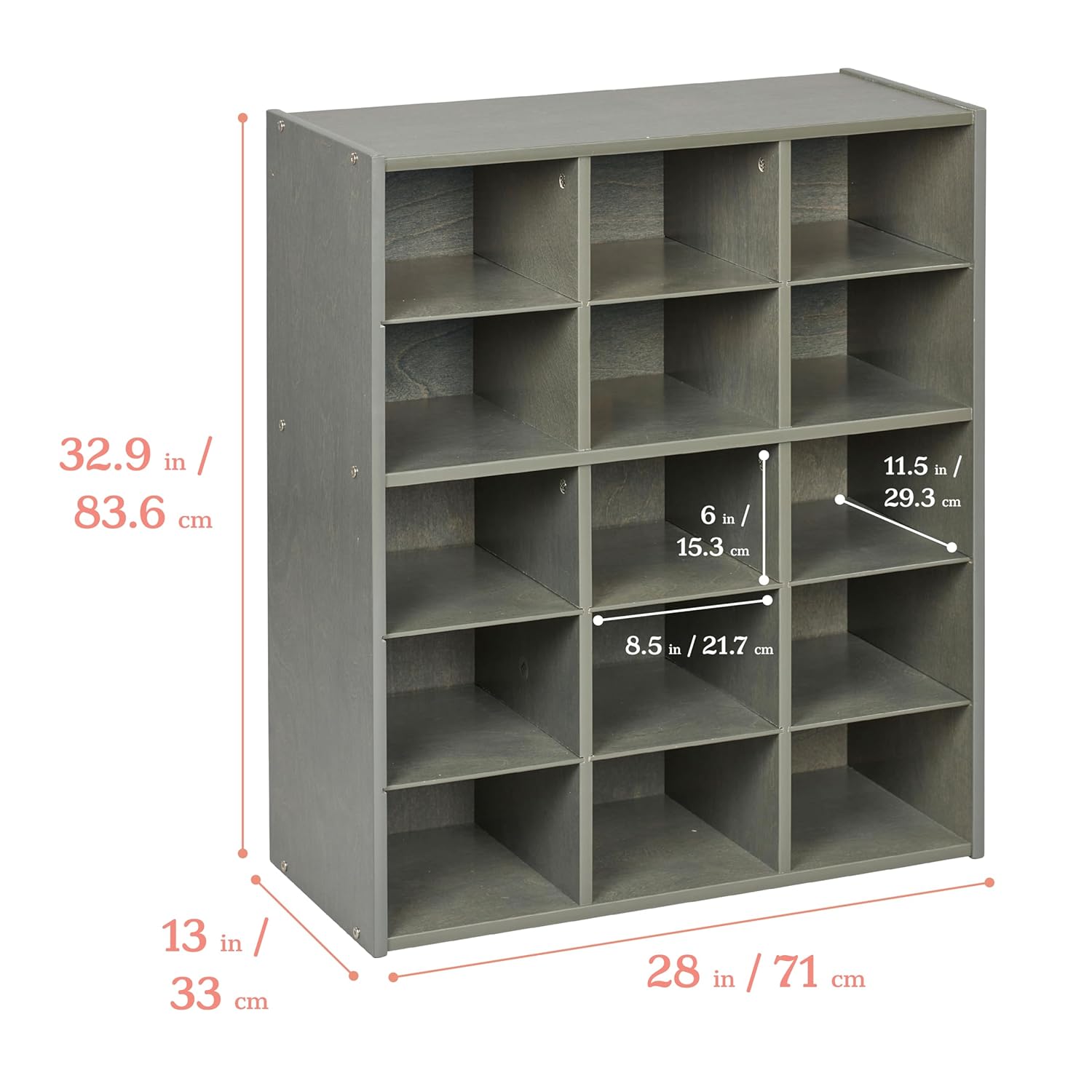 - Product Dimensions: Storage organizer measures 28" D x 13" W x 32.9" H; individual cubbies measure 8.5” W x 11.5” D x 6” H; adult assembly required; Adult Active Engaged & Direct Supervision Required