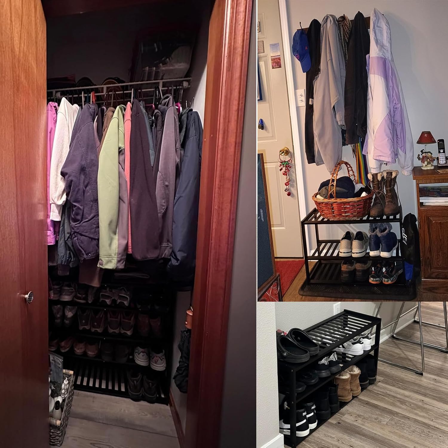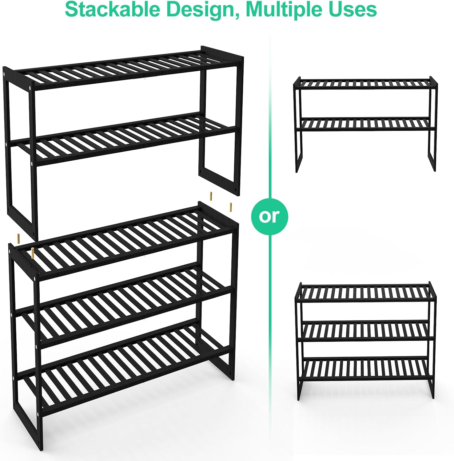 - 𝐁𝐚𝐦𝐛𝐨𝐨 𝐒𝐡𝐨𝐞 𝐑𝐚𝐜𝐤: Extremely well-made of high-quality eco-friendly bamboo wood which is very durable and has a smooth finish. Bamboo layer with antique craft paint, smooth and delicate, anti-deformation, and waterproof. The structure is firm and ensures load-carrying capacity. At the same time, the smooth surface will make your cleaning easier, wet rags or water is not a problem, saving you time and energy. Not only a black shoe rack and adding more decoration to your home. This practical bamboo shoe rack can be used as an excellent Christmas, Thanksgiving Day, or birthday gift for your lovely families or friends.