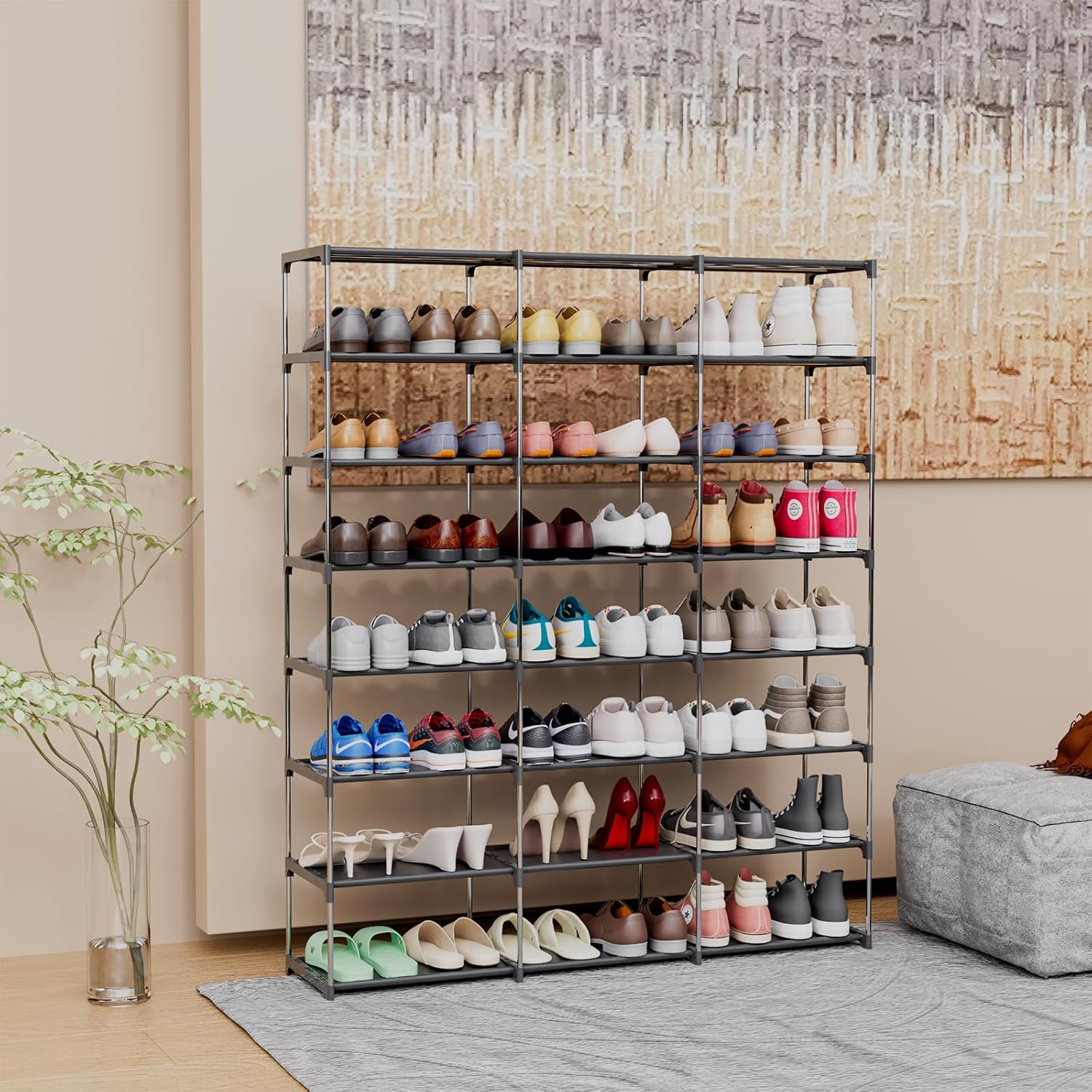 - Versatile Family-Friendly Design: SMILHELTD shoe rack is designed to cater to the entire family's shoe storage needs. With its 3-row, 8-tier, it accommodates 45-54 pairs of shoes, shoe tower unit measures 50.8"L x 49.2"H x 10.8"W, each grid size:15.8"L*10.8"W*6.4"H, making it has a perfect storage solution.