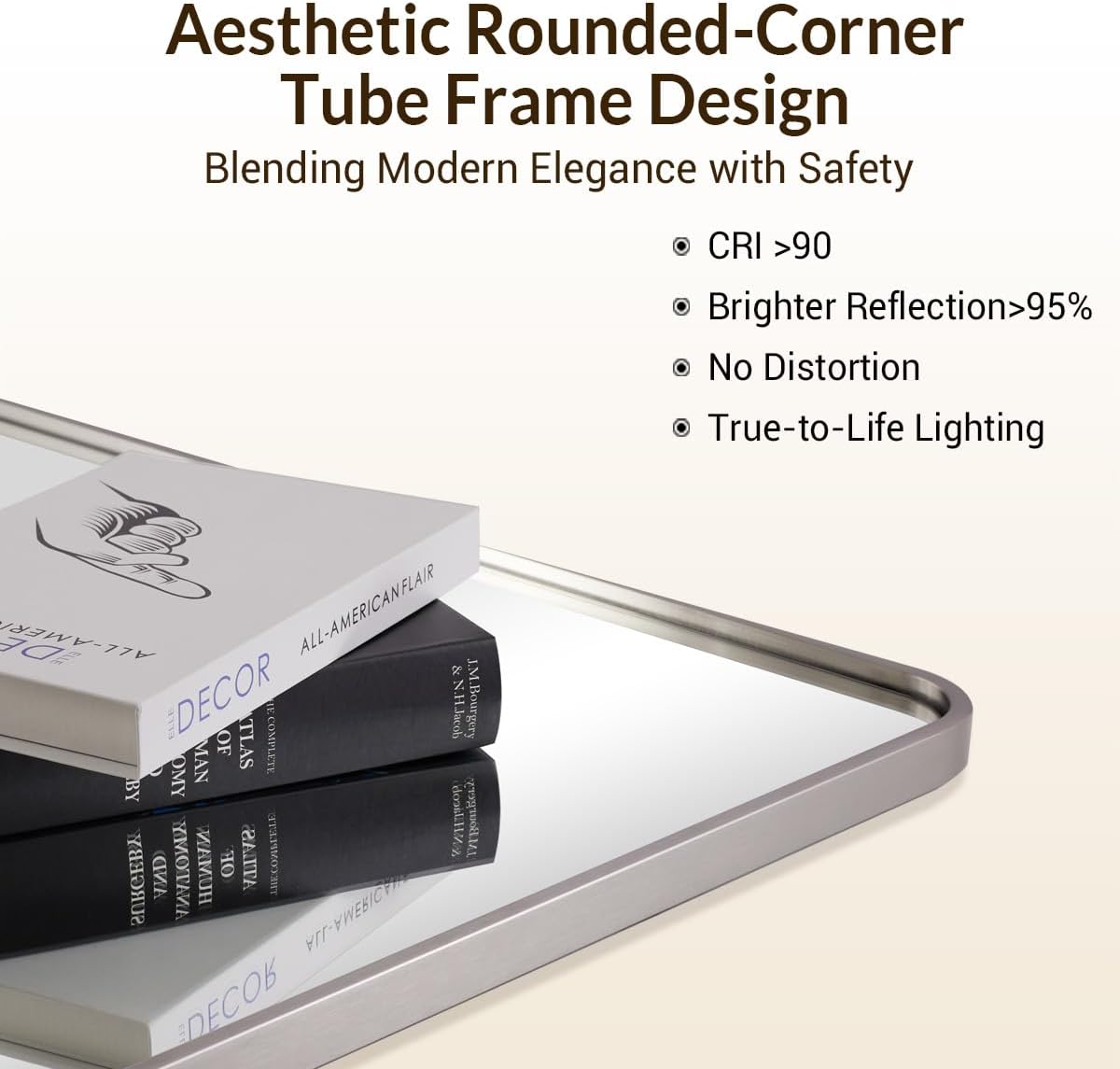 - UPGRAGING DESIGN: The frame of this bathroom mirror is 3/8inch(10mm)width by 1inch Depth. The satin nickel color with the contemporary rounded frame design present the beauty and the difference of this ANDY STAR mirror