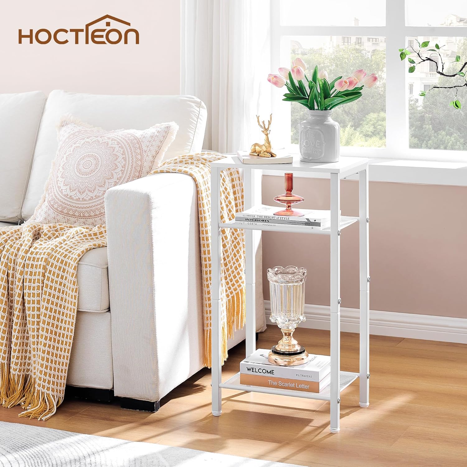 Hoctieon 3 Tier End Table, Telephone Table, Narrow Side Table with Storage, Nightstand for Small Spaces, Metal Frame, for Living Room, Bedroom, Sofa Couch, Hall, Easy Assembly, White