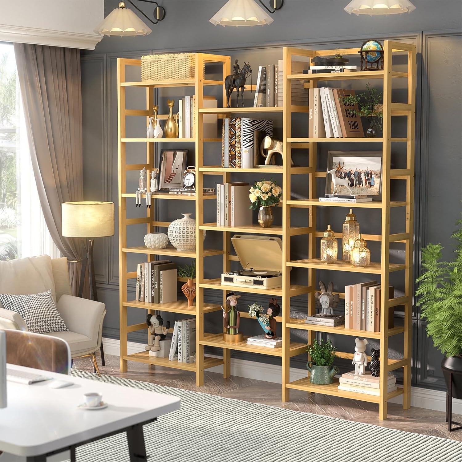 - Ultra-Sturdy Structure: Made of 100% thickened bamboo wood with exquisite craftsmanship and a sturdy structure for long-term use. The triple wide bookshelf is equipped with side and rear fences to prevent books or items from falling. Besides, there is a crossbar under each shelf to enhance the load-bearing capacity. For safety, you can secure the bamboo bookshelf to the wall using the included anti-tip device to prevent it from accidentally tipping over.