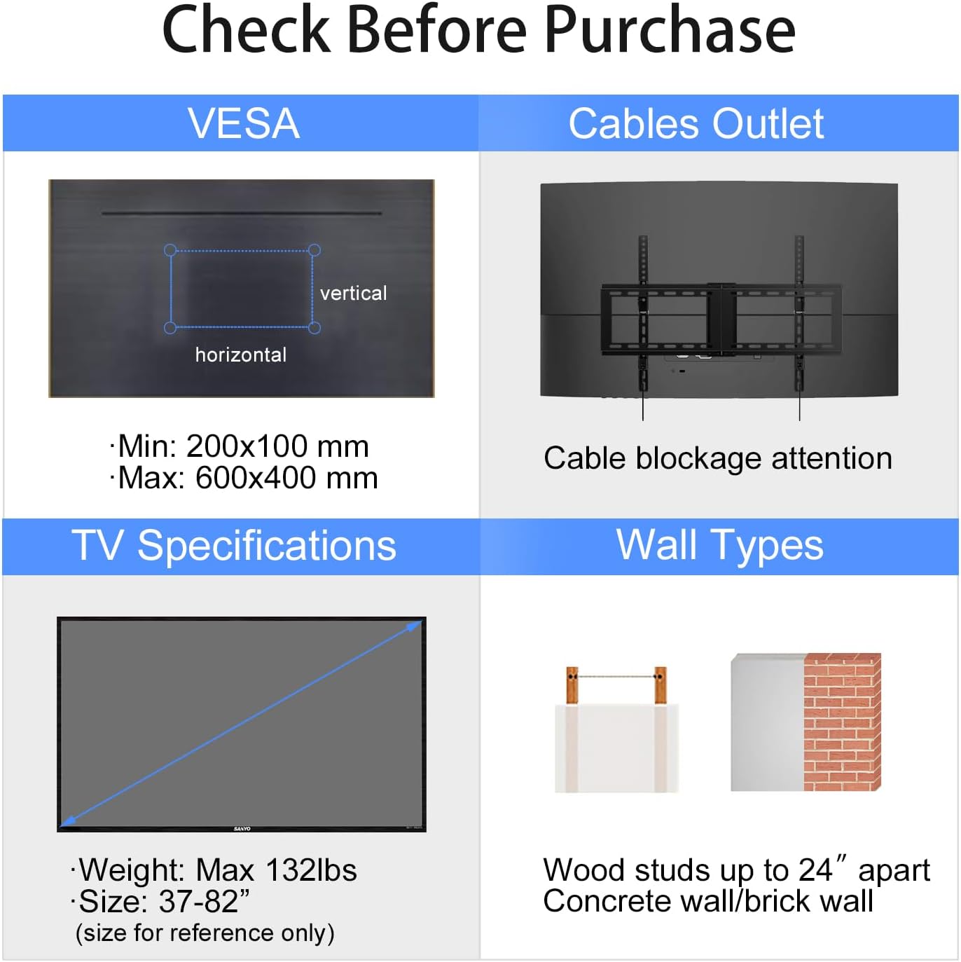 - Notice - before purchasing, check the VESA, TV weight, wall stud location, and possible blocked inputs and outlets.