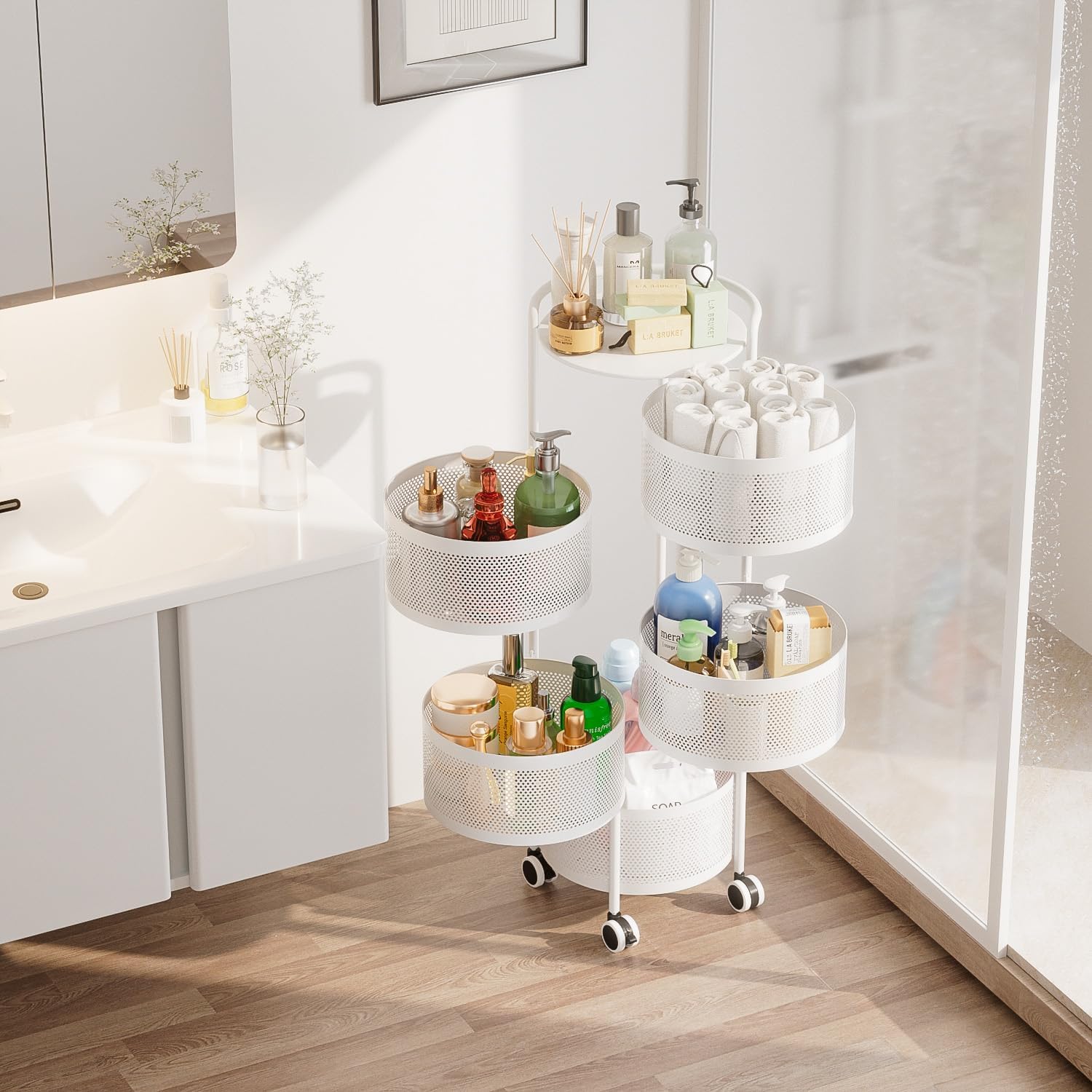 JAQ Rotating Fruit Basket, 5-Tier Metal Sturdy Kitchen Storage Rack Carts No Assembly on Rolling Wheels for Fruit Vegetable Grocery Corns Potato Onion in Bathroom(White, 5-Tier)