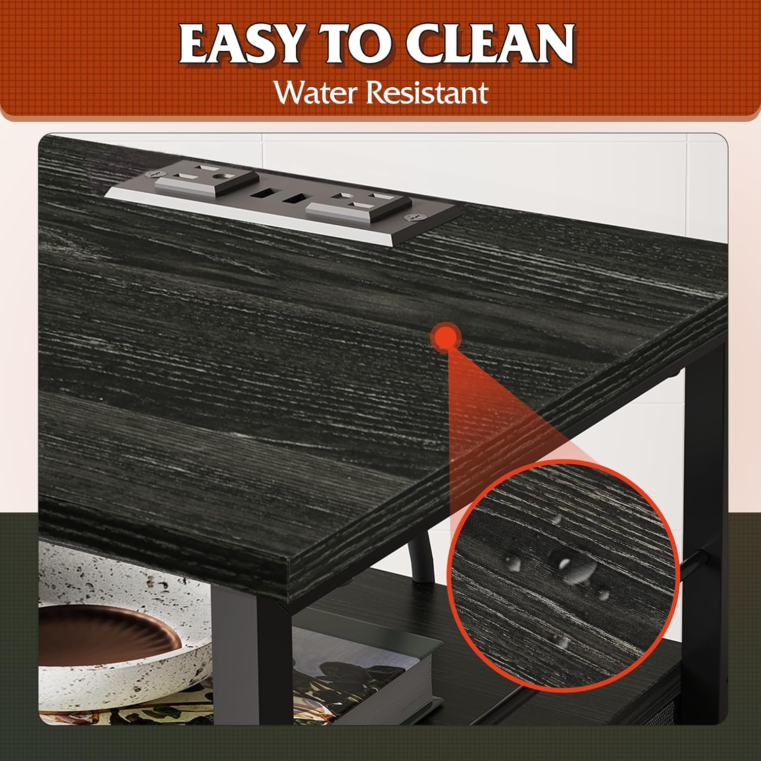 - [Nightstand with Charging Station]: No electricity? Don't worry. This end table comes with 2 standard plug outlets and 2 USB ports for most electronics. The layout of outlests is just right to avoid chargers‘ mutual interference and meet your needs for charging 4 devices at the same time.