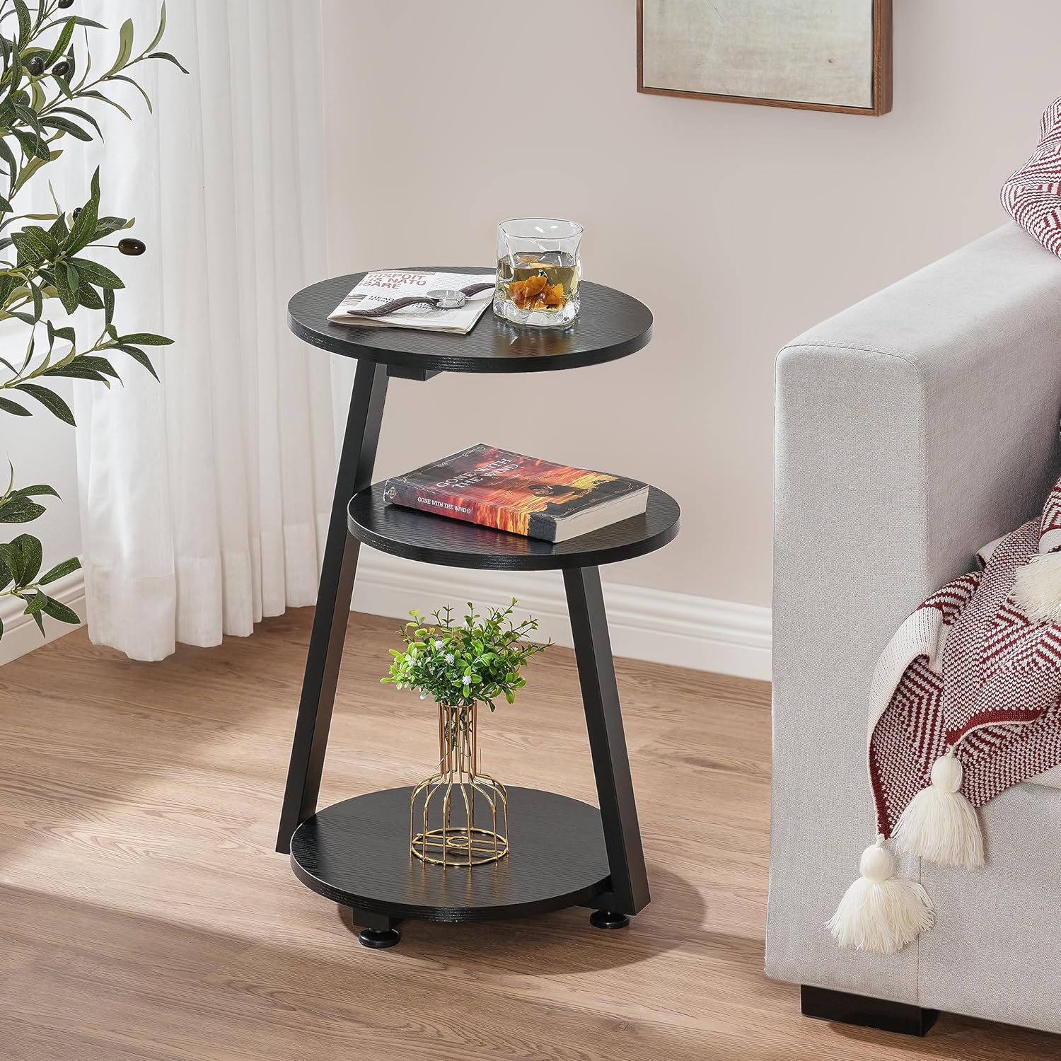 BEWISHOME Round End Table Side Table with Metal Frame, Accent Nightstand Bedside Table with 3-Tier Shelves, Small Couch Table for Living Room Bedroom Black KTZ41B