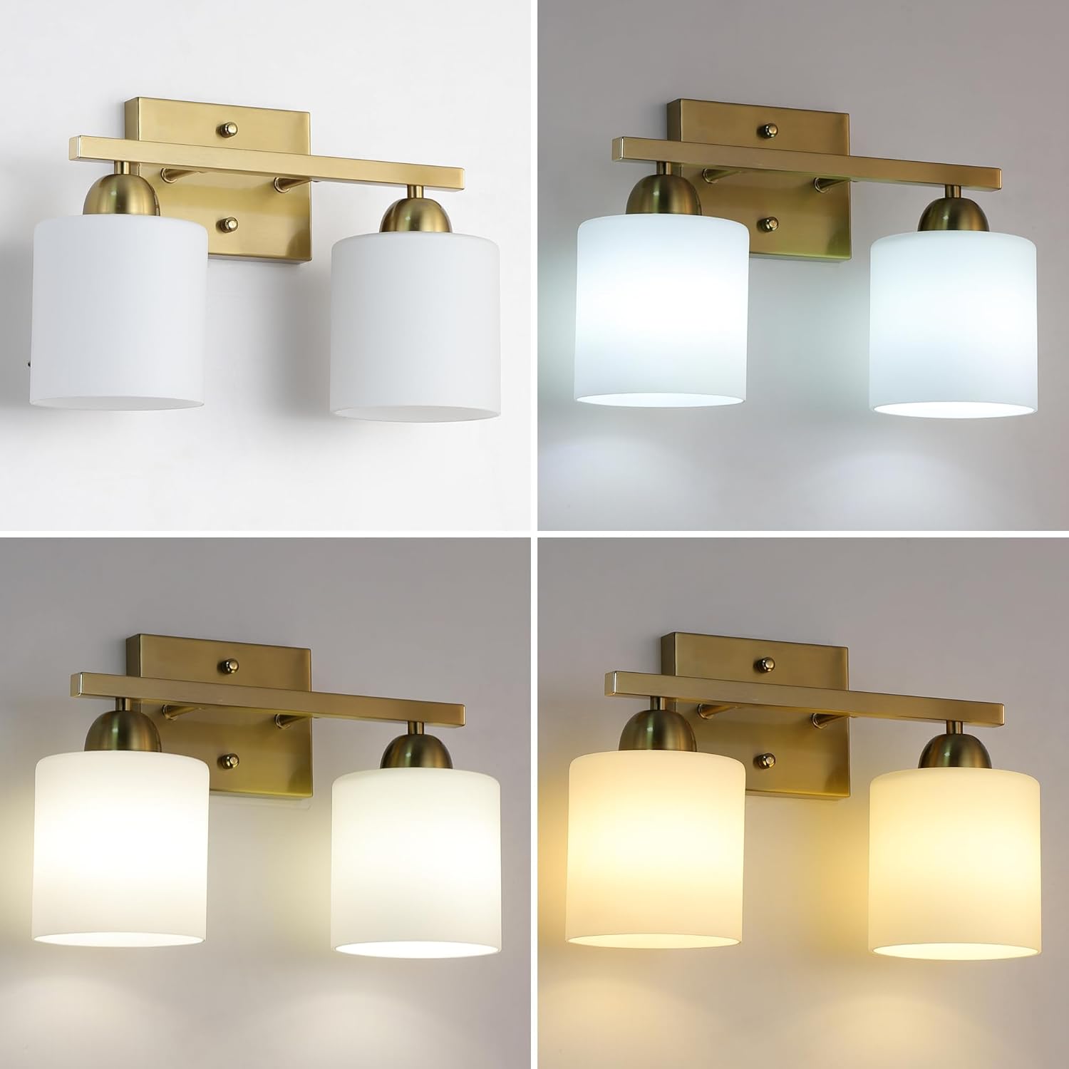 Stainless Steel Milk Glass Vanity Lights for Bathroom, 2 Light Gold Bathroom Light Fixtures Over Mirror, Ceramic E26 Sockets Wall Mounted