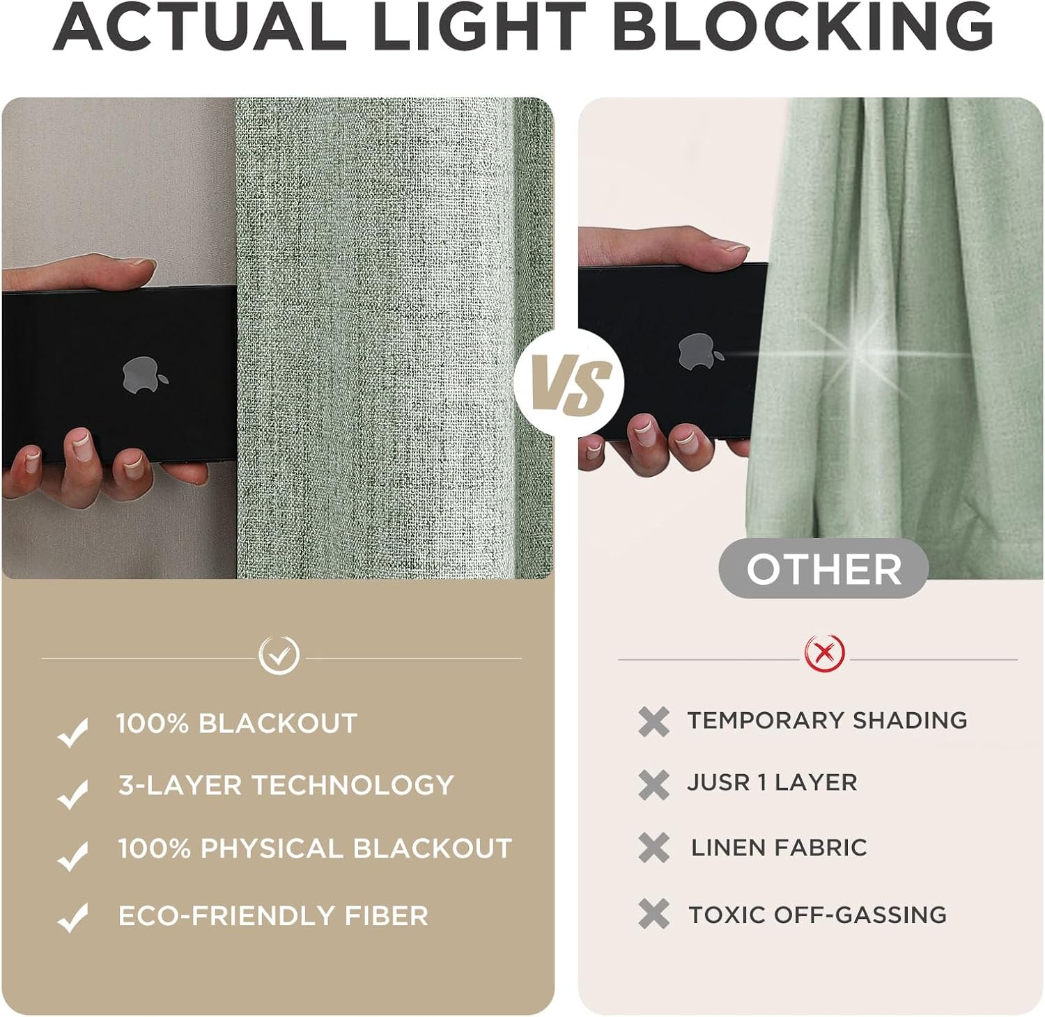 - 100% Blackout: Joydeco blackout curtains are double layered with grey liner on the back. The innovative double woven textured fabric can block out entirely 100% sunlight and harmful UV ray (deep colors work better), keeping room cooler against heat in summer and retaining the room warm in winter.