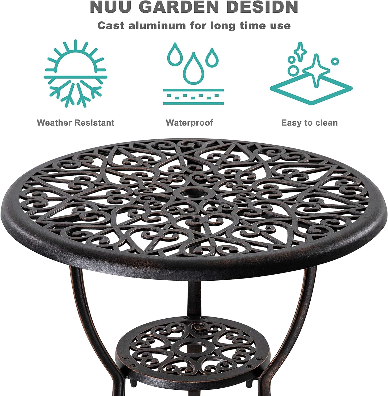- NUU GARDEN BISTRO SET: The cast aluminum 3 piece bistro set outdoor has a 1.77" umbrella hole which fits most patio umbrellas and a holder for fixing the umbrella. Outdoor table and chairs takes you on a relaxing holiday in deck, yard, balcony, garden, lawn, front porch, pool