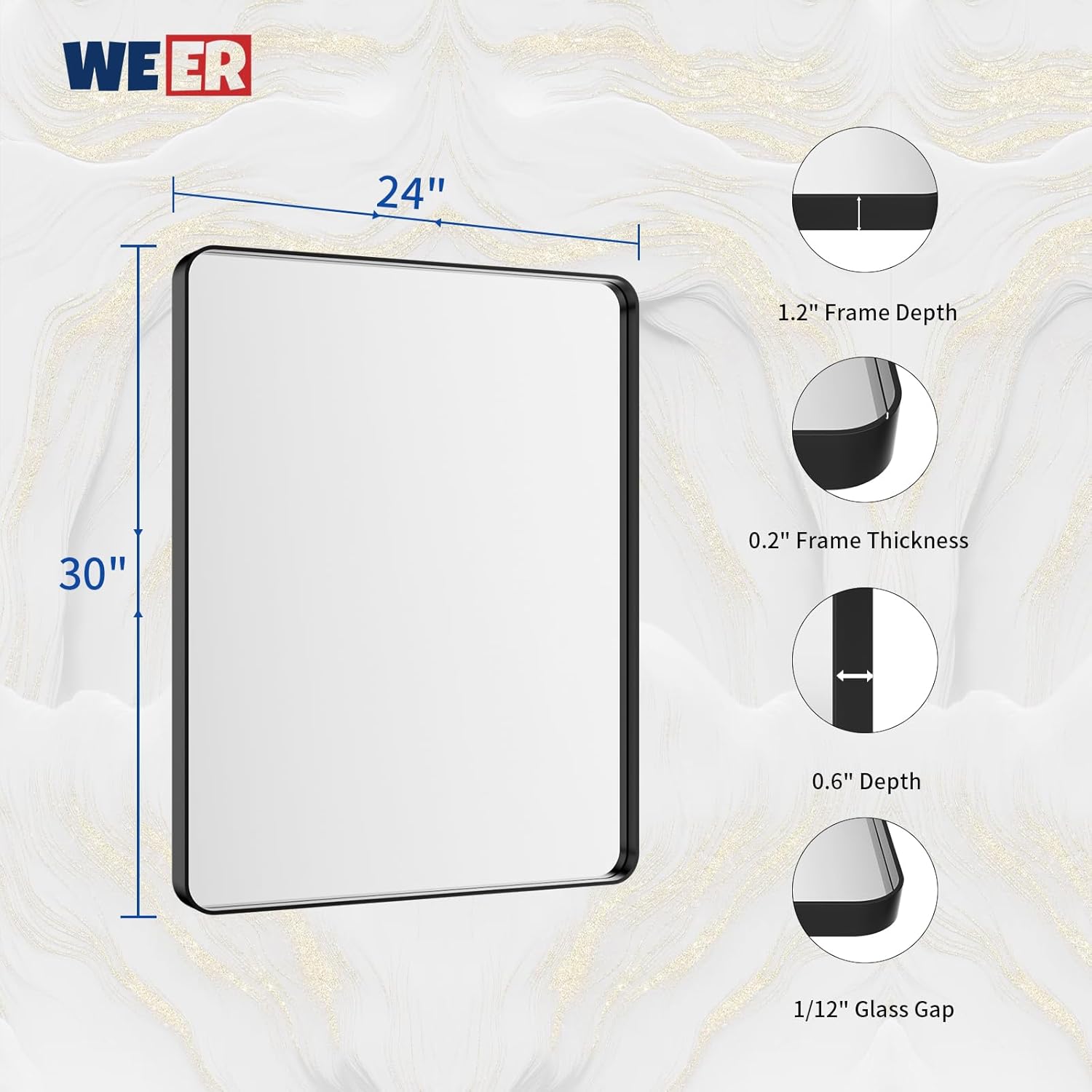 - 【Durable Black Metal Framed Mirror】: WEER black bathroom vanity mirror is made of premium alumium alloy frame, which is anti-rust and non-deformed. Practical rectangle rounded corner mirror with simple classic clean line features the modern and industry style;