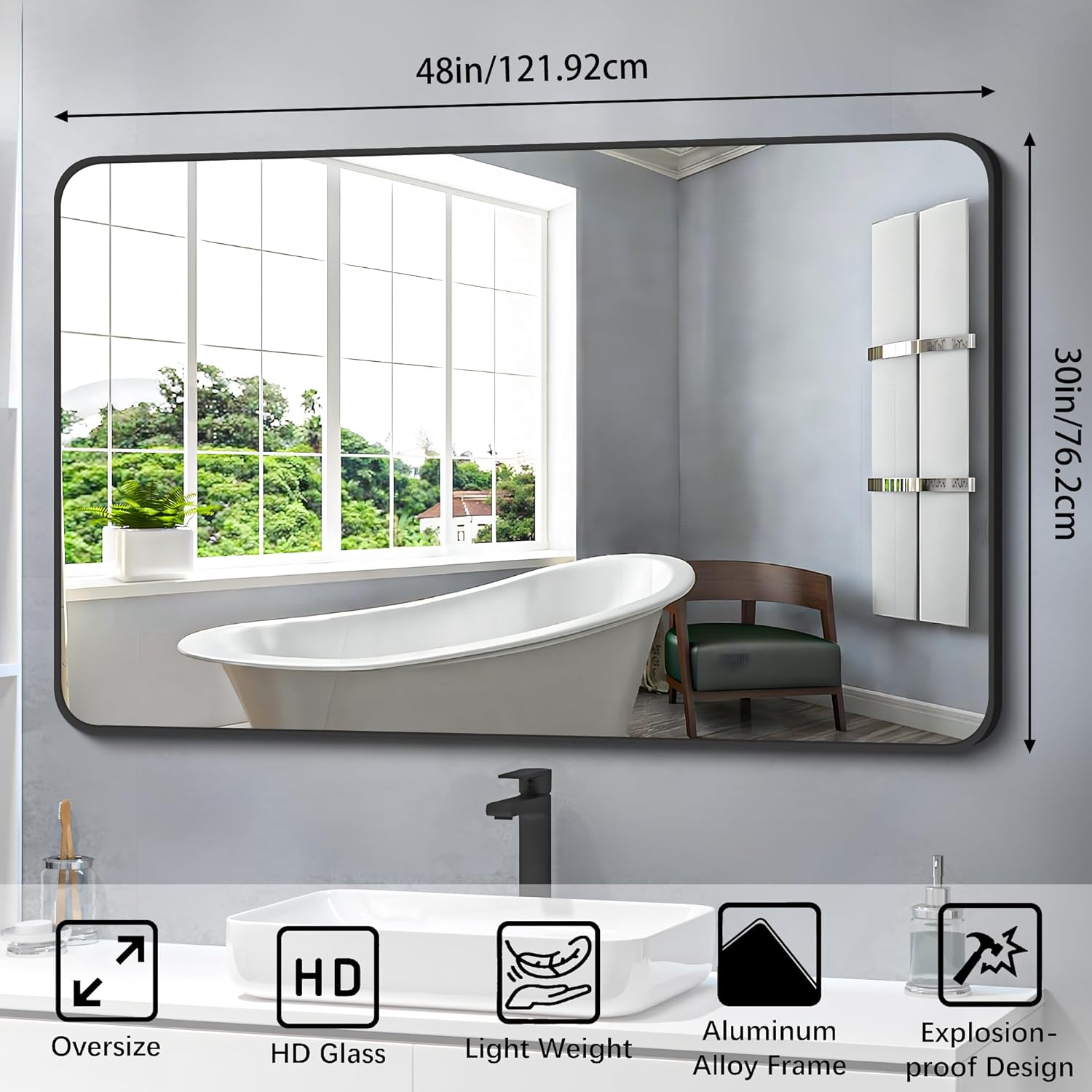 - Large Bathroom Mirror: Bathroom Mirror 30×48 inches. This is an oversized bathroom mirror that will add atmosphere to your bathroom.Simultaneously balancing practicality and decoration.