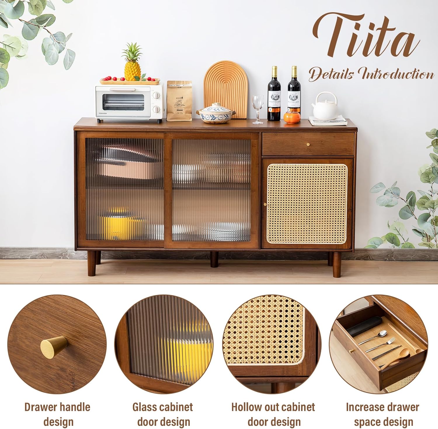 Tiita Bamboo Sideboard Buffet Cabinet, Rattan Kitchen Storage Cabinet with Drawer, Boho Coffee Bar Tables for Kitchen Hallway Office, Walnut