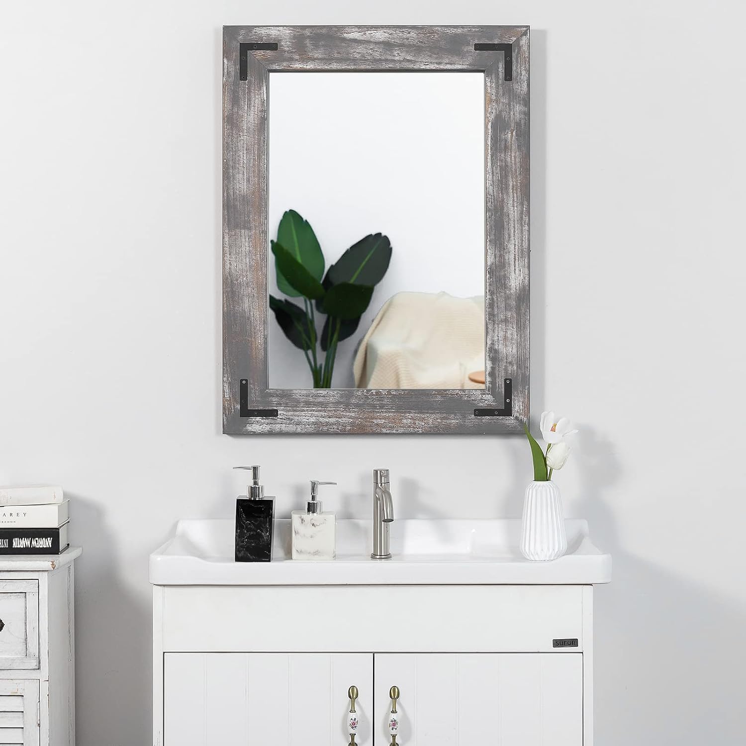 - RUSTIC WOOD VANITY MIRROR: Vanity mirror brings rustic character to any wall, while a black metal mount gives this design a modern farmhouse twist. Introduce a rustic touch to your farmhouse bathroom with this rustic wall mirror, a perfect pick for modern-farmhouse-inspired spaces.