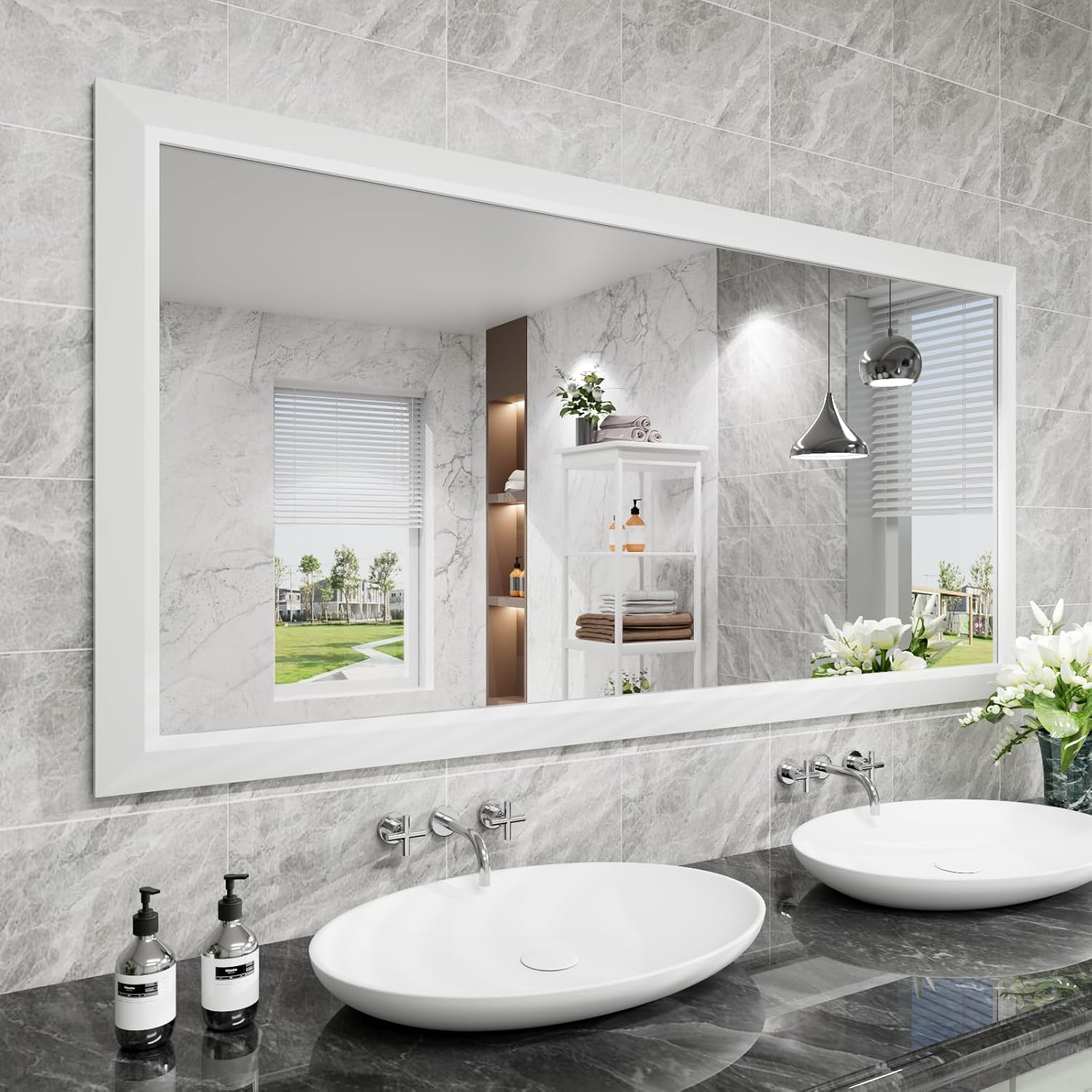 Amorho Bathroom Mirror, 60 X30 Inch White Thick Metal Framed Wall Mirrors for Over 2 Sinks, Bedroom, Living Room, Entryway, Large Rectangle Wall-Mounted Mirrors.