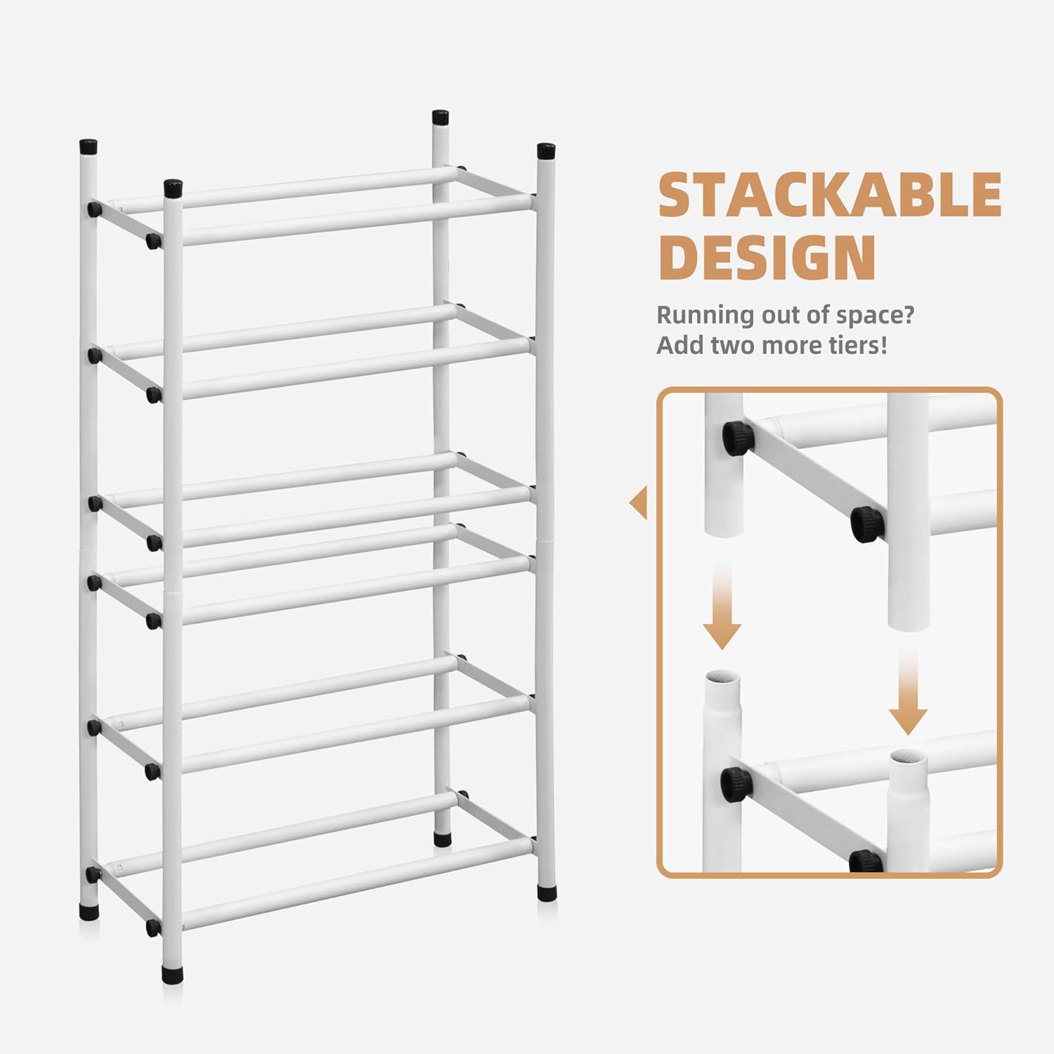 - STACKABLE - This shoe rack can save the floor space and maximize the use of vertical space. The 3 tier shoe rack can be purchased in any combination to meet different needs, like 5-Tier, 6-Tier, 7-Tier, 9-Tier etc. The metal shoe rack fits any small space.