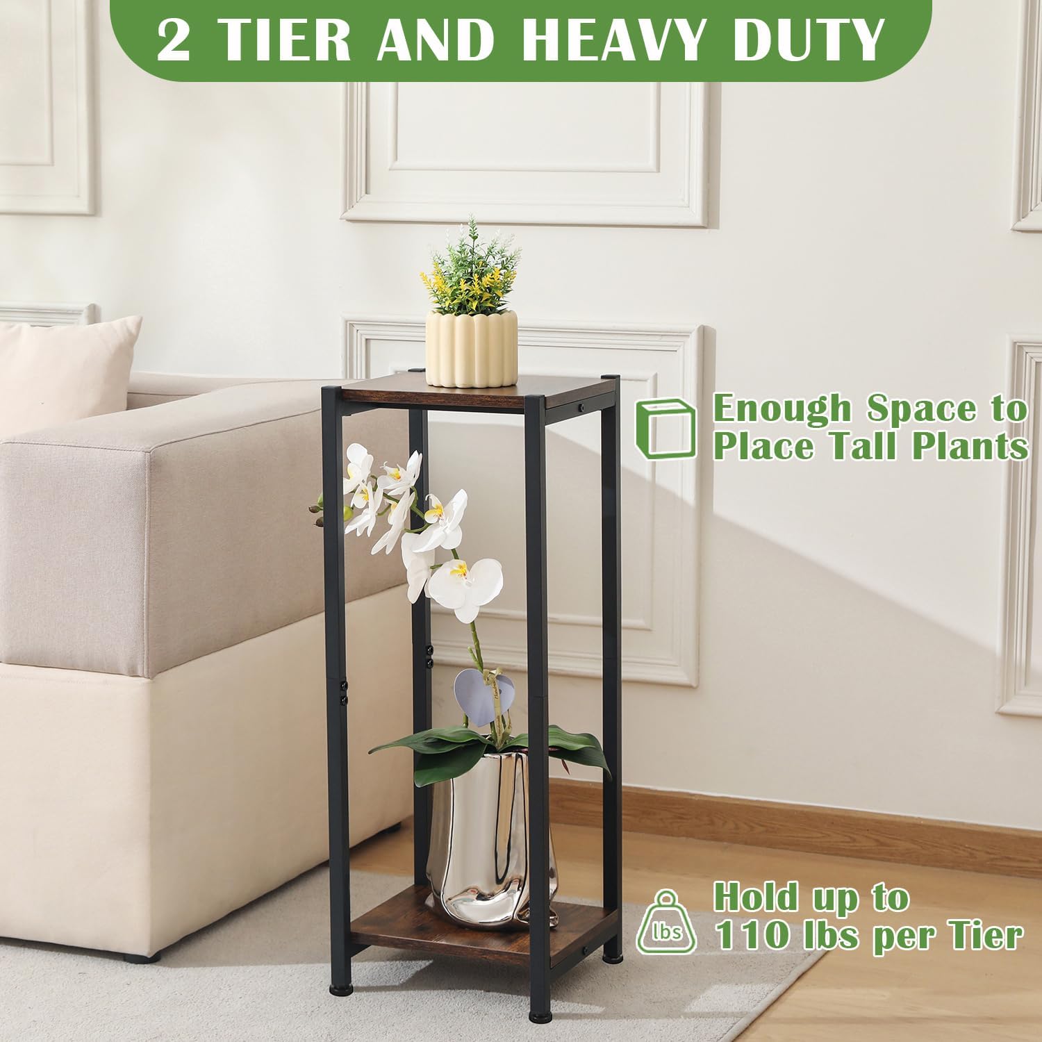 - Hold up to 110 lbs:Made of thick metal pipes(20x20mm) and heavy weight E1 particle board(15mm),two brown wood shelves are screwed to the stand,the brown plant stand can hold up to 110 lbs per tier.