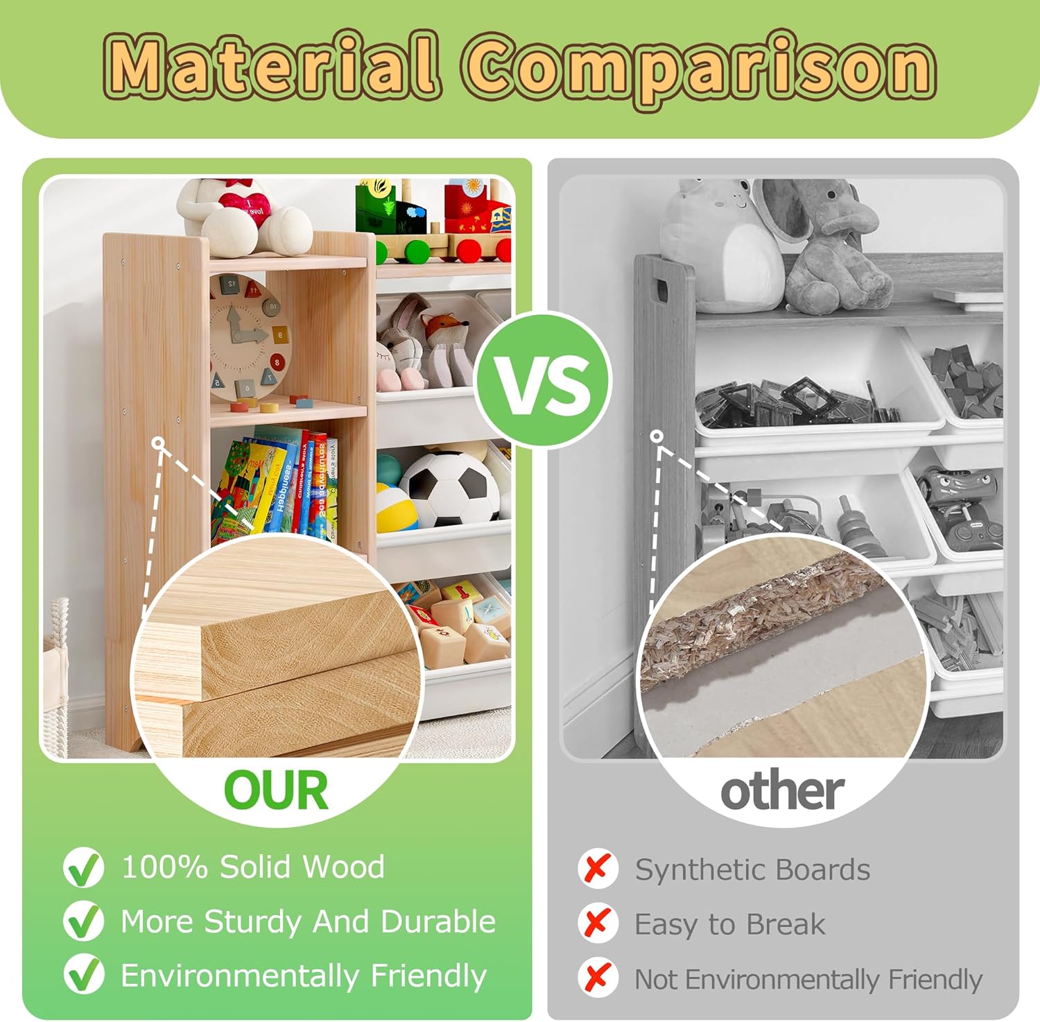 - HIGH QUALITY MATERIALS - Kids’ toy storage organizer are made from high quality pine wood.The solid wood manufacturing process makes this product more environmentally friendly and durable than other storage cabinets made of plastic or synthetic boards.Lead-free environmentally friendly varnish,so that your baby away from chemical damage.