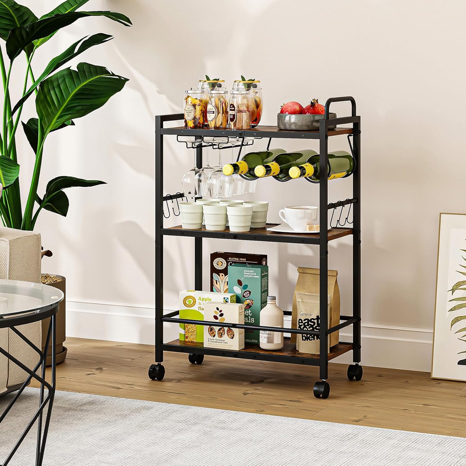 Home Bar Serving Cart, Serving Cart with Wheels and Handle, 3 Tier Rolling Kitchen Cart, Microwave Cart, Beverage Cart with Wine Holder and Glass Holders, for Dinning Room, Living Room, Kitchen