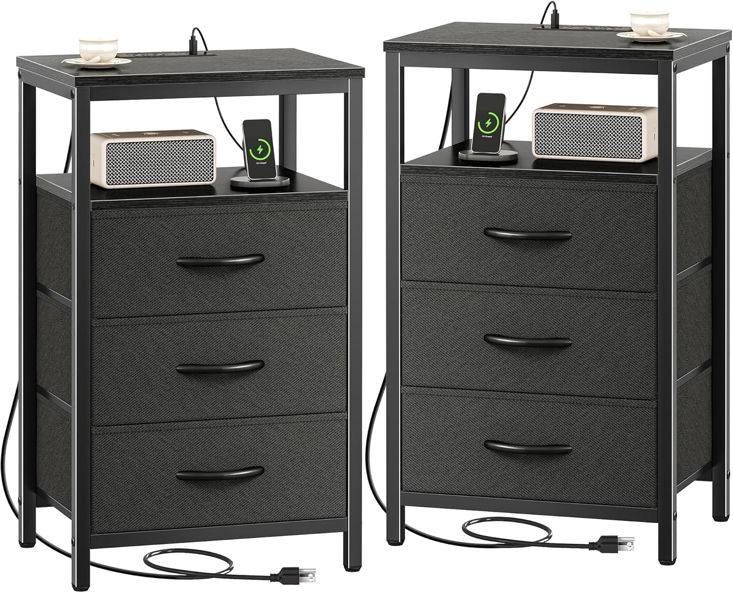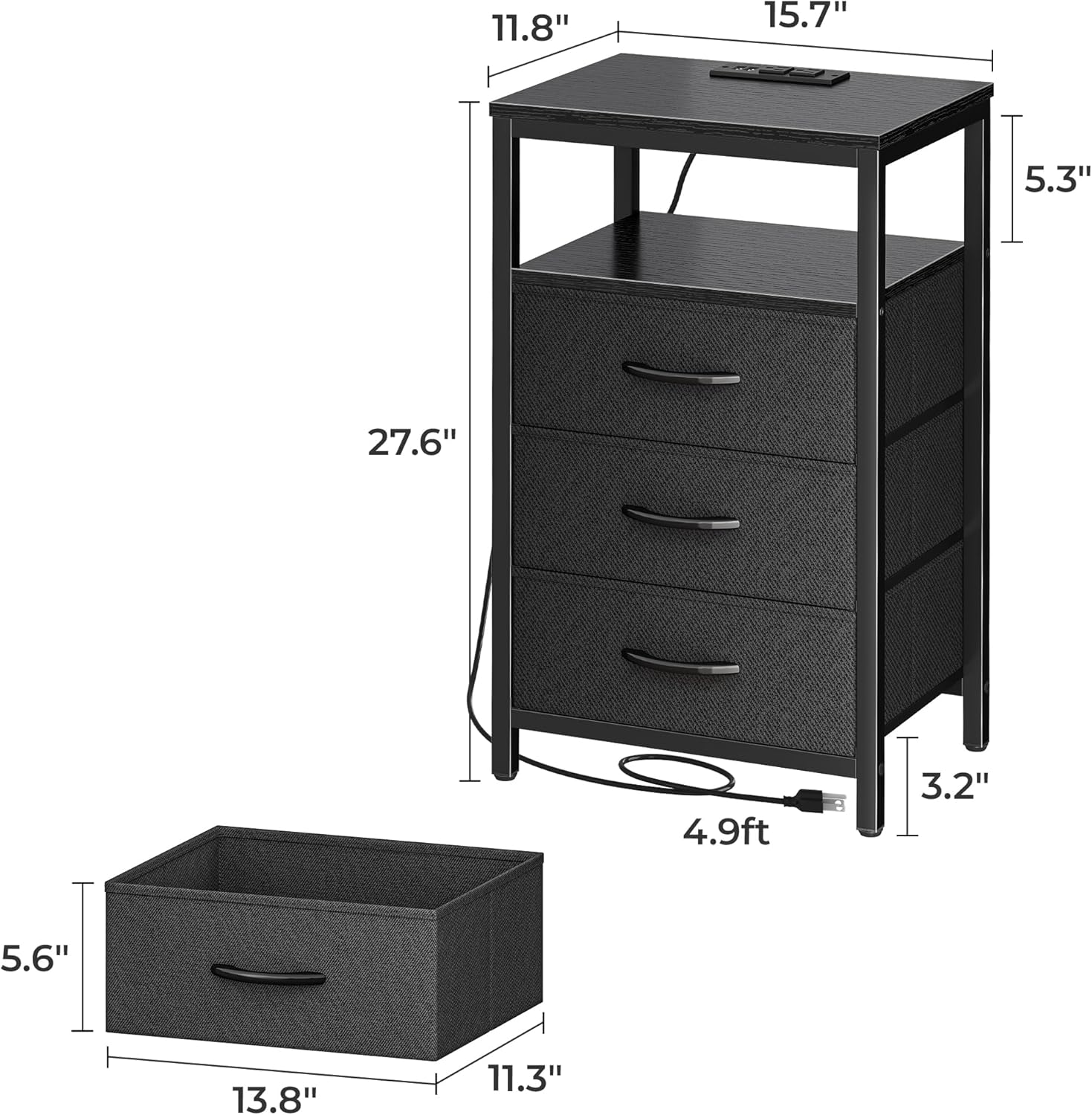 Huuger Nightstands Set of 2, 27.6 Inch End Tables with Charging Station, Bed Side Tables with Fabric Drawers, USB-C Port and Outlet, Night Stands for Bedroom, Black