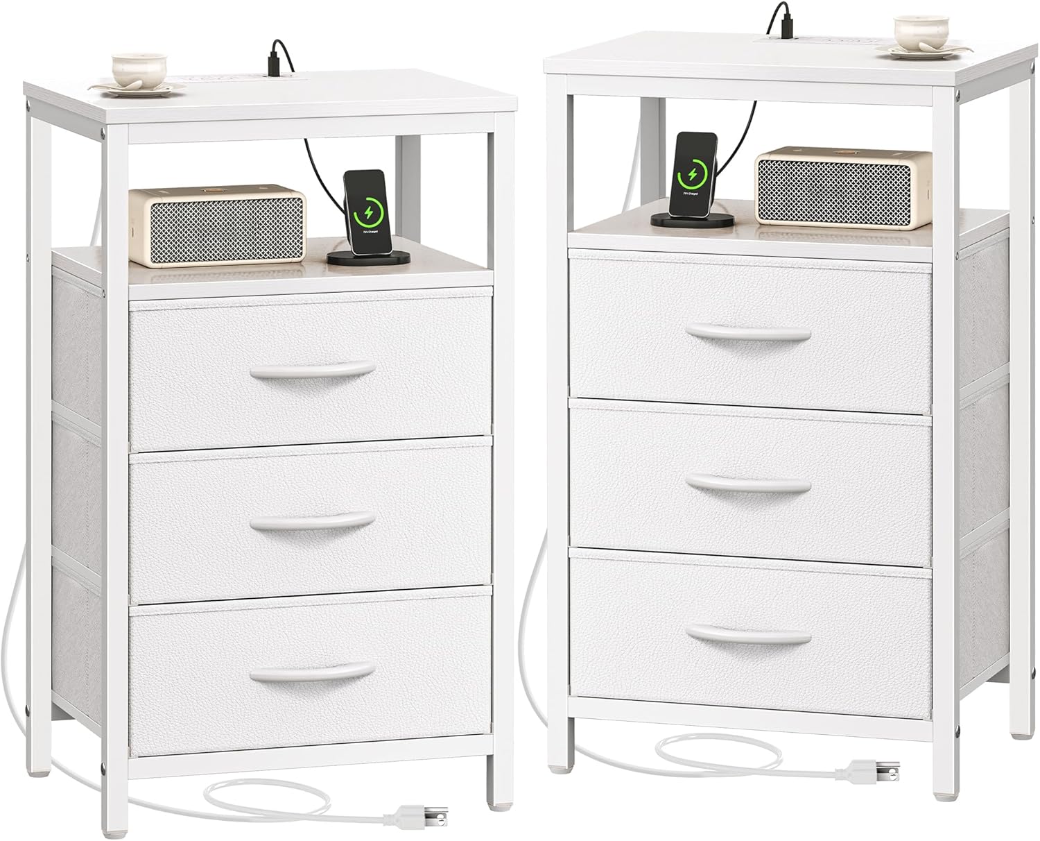 Huuger Nightstands Set of 2, 27.6 Inch End Tables with Charging Station, Bedside Tables with Drawers, PU Leather Finish, USB Port and Outlet, Night Stands for Bedroom, White