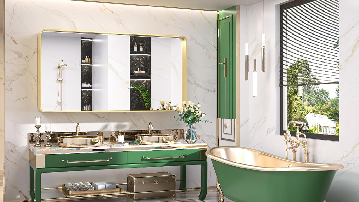 TokeShimi Bathroom Vanity Mirror 48 x 24 Inch Gold Metal Frame Round Corner Rectangular for Home Decor Living Room Entryway (Horizontal/Vertical)