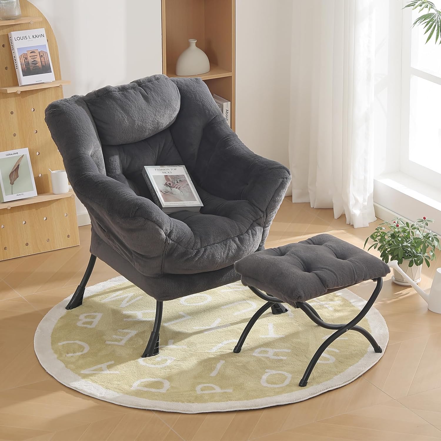 Oversized Chair with Ottoman, Modern Reading Chair, Lounge Accent Chair with Armrests and a Side Pocket for Small Space, Bedroom, Study, Living Room (Plush Dark Greyish Blue)