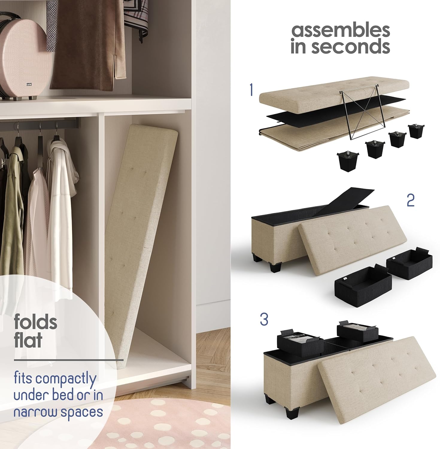 - Beige Ottoman Storage Bench: This storage ottoman with storage for living room decor transforms your space and reduces clutter, and can be used as a storage ottoman bench or ottoman foot rest. Max weight 660 lbs.