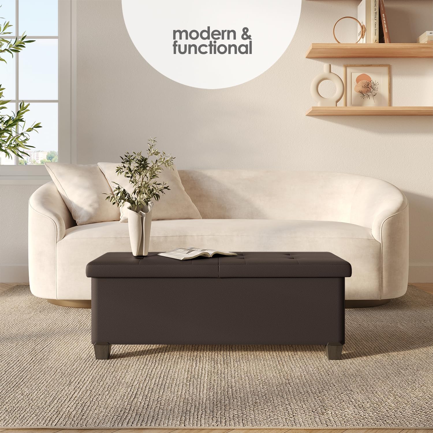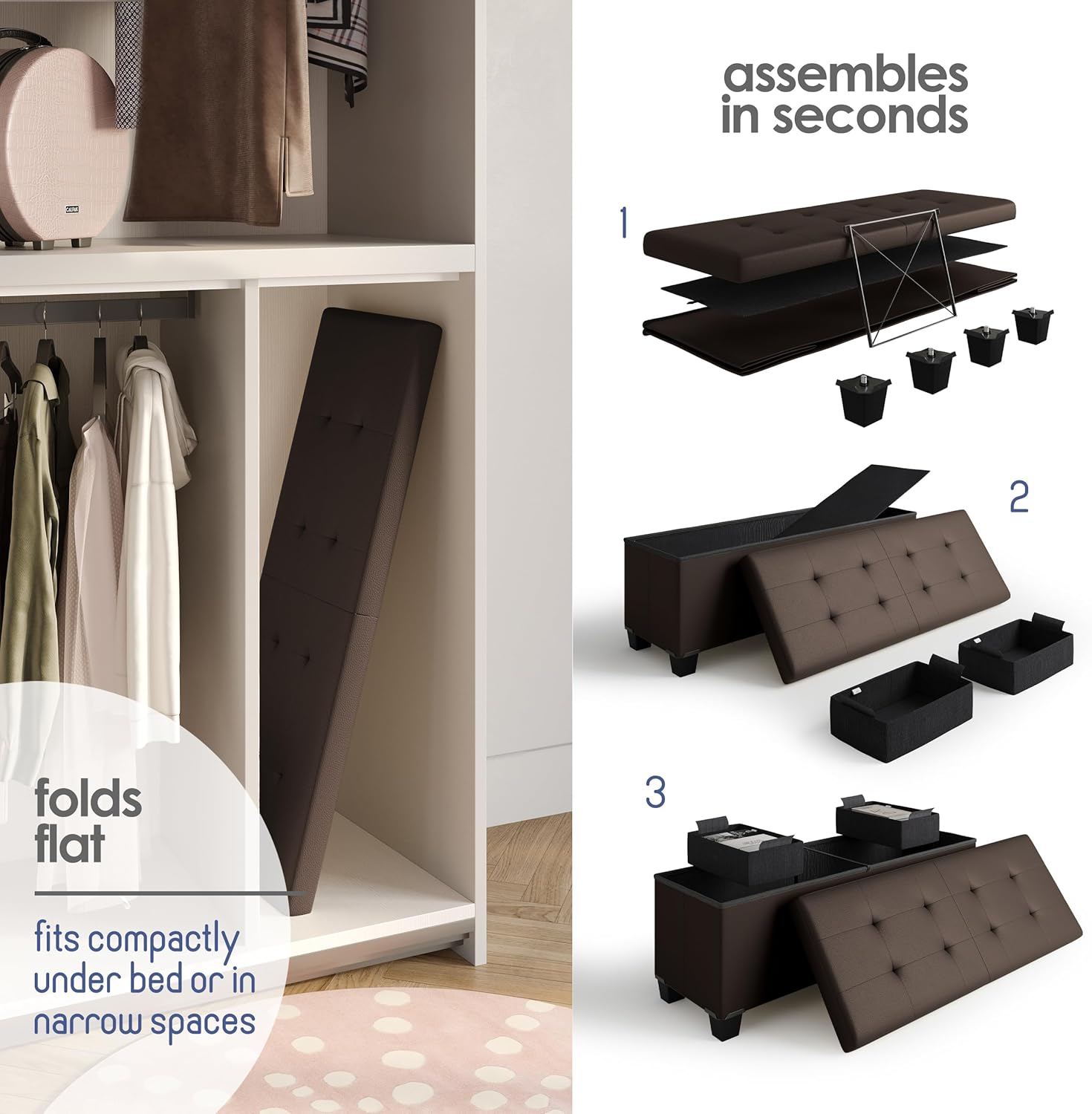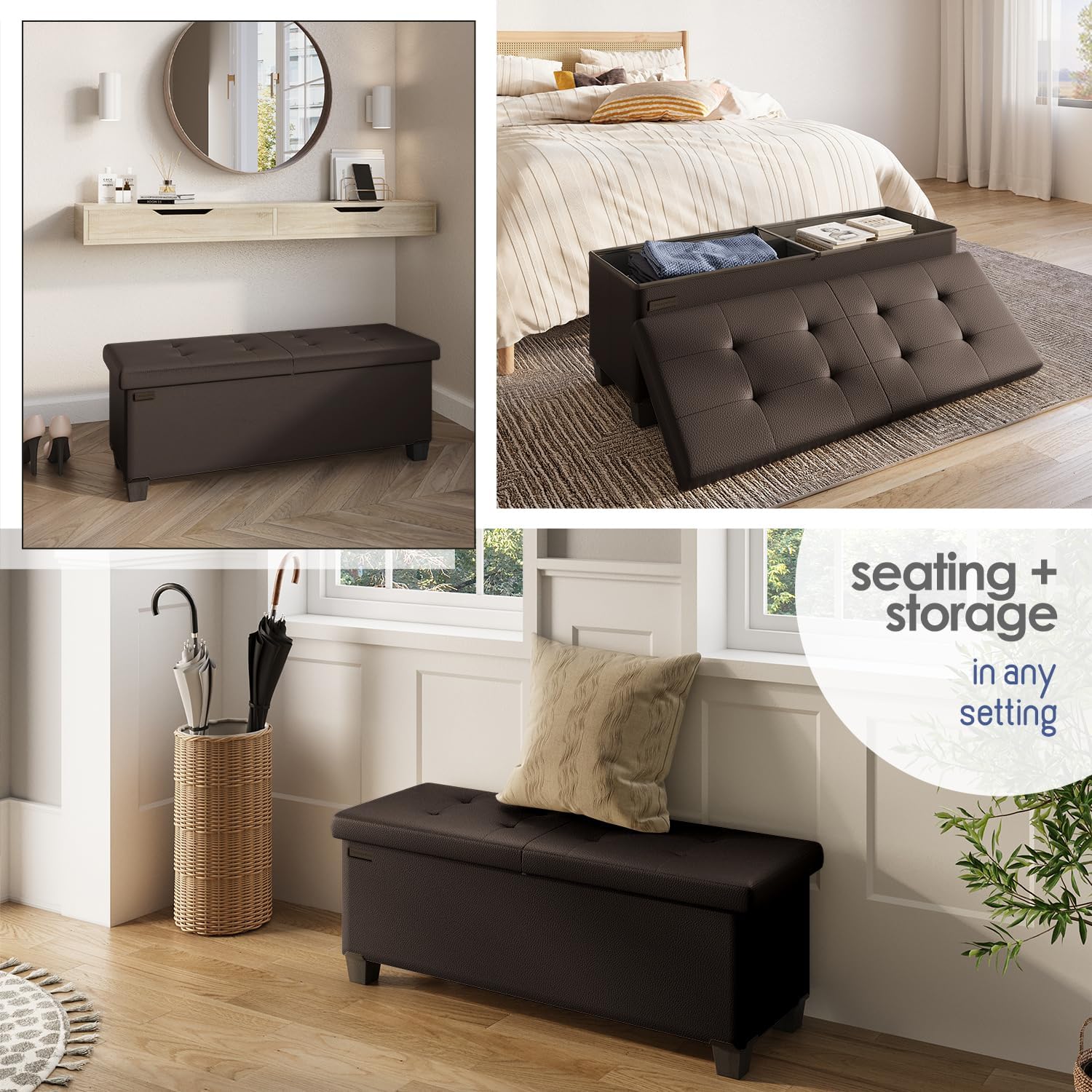 STORAGEBUD Storage Ottoman Bench with Bins, 43-in Storage Bench for Bedroom End of Bed, Folding Foot Rest Ottoman for Living Room Max 660lbs, Faux Leather Ottomans, Brown