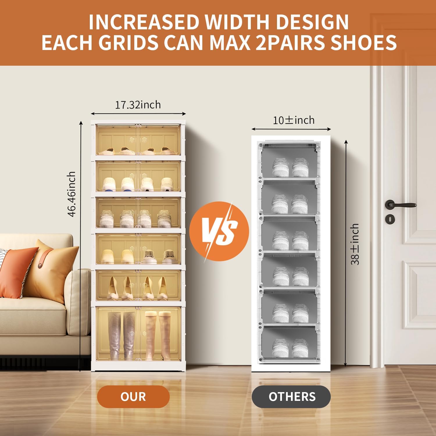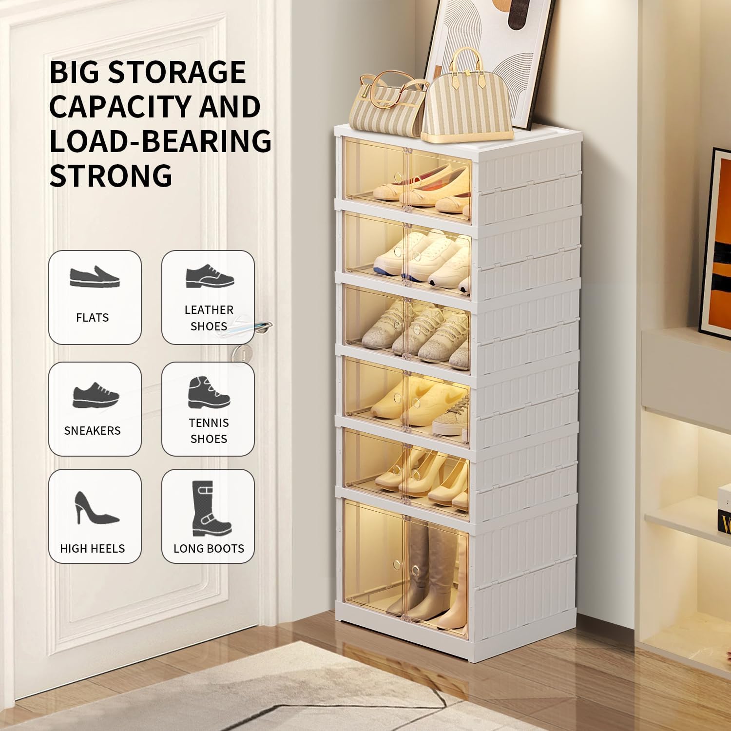 - Easy Clean And Identify: Foldable Shoe storage cabinet with light brown clear doors, make it easy quickly find the shoes what you need. Shoe storage organizer with doors have wheel, easy to move and clean, more fashionable and luxurious