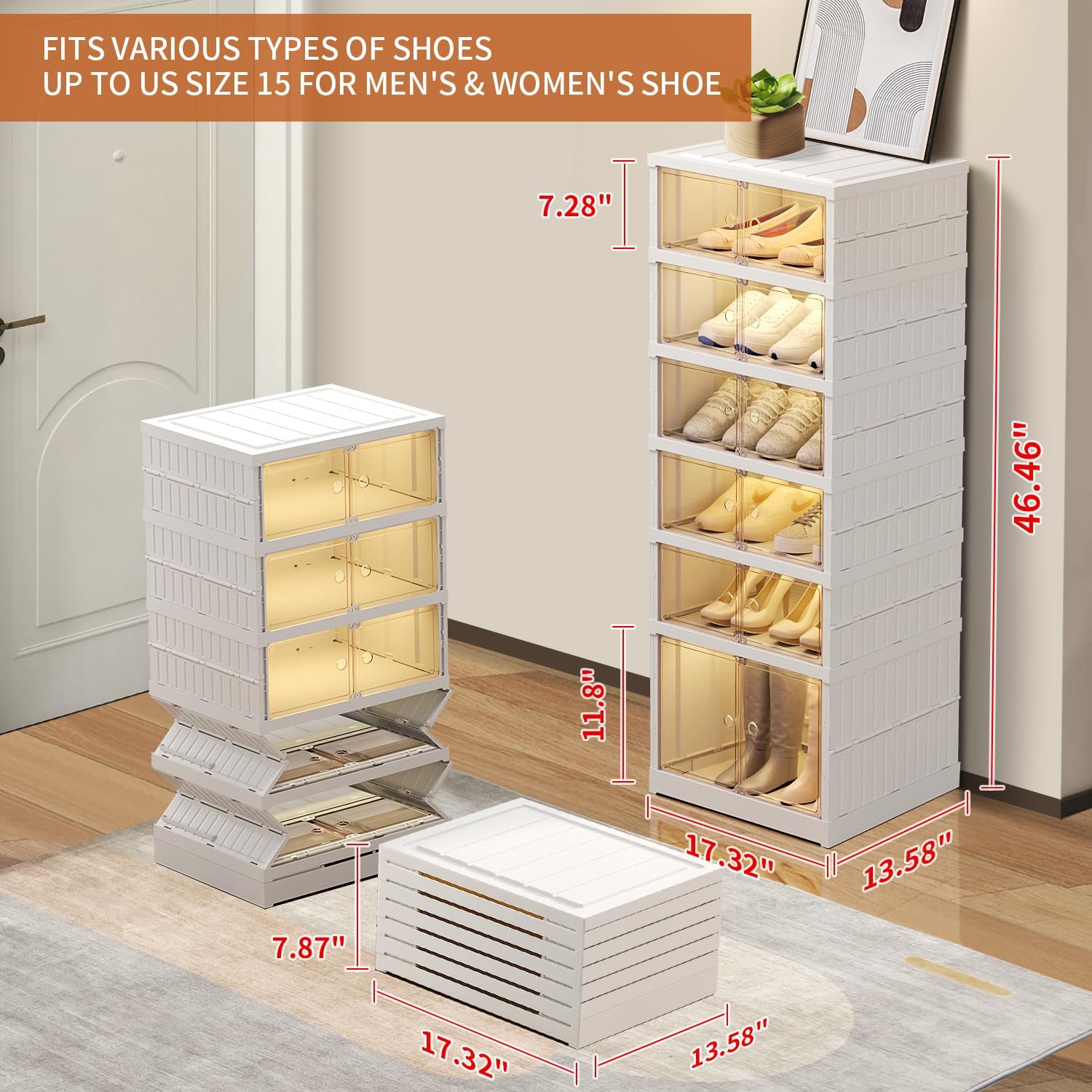 - Tall Boots Storage Design: The expandable size of the plastics foldable shoe racks organizer: 17.32"L*13.58"W*46.46"H, including 6 Tiers(5Grids + 1Large grids). Shoe organizer for closet can accommodate up to 12 pairs of shoes. Multi-layer shoe rack storage organizer fits all types of shoes and can store men's and women's shoes up to size 15. Closet shoe rack for entryway has a 1-Large grids heightened design, suitable for storing long boots
