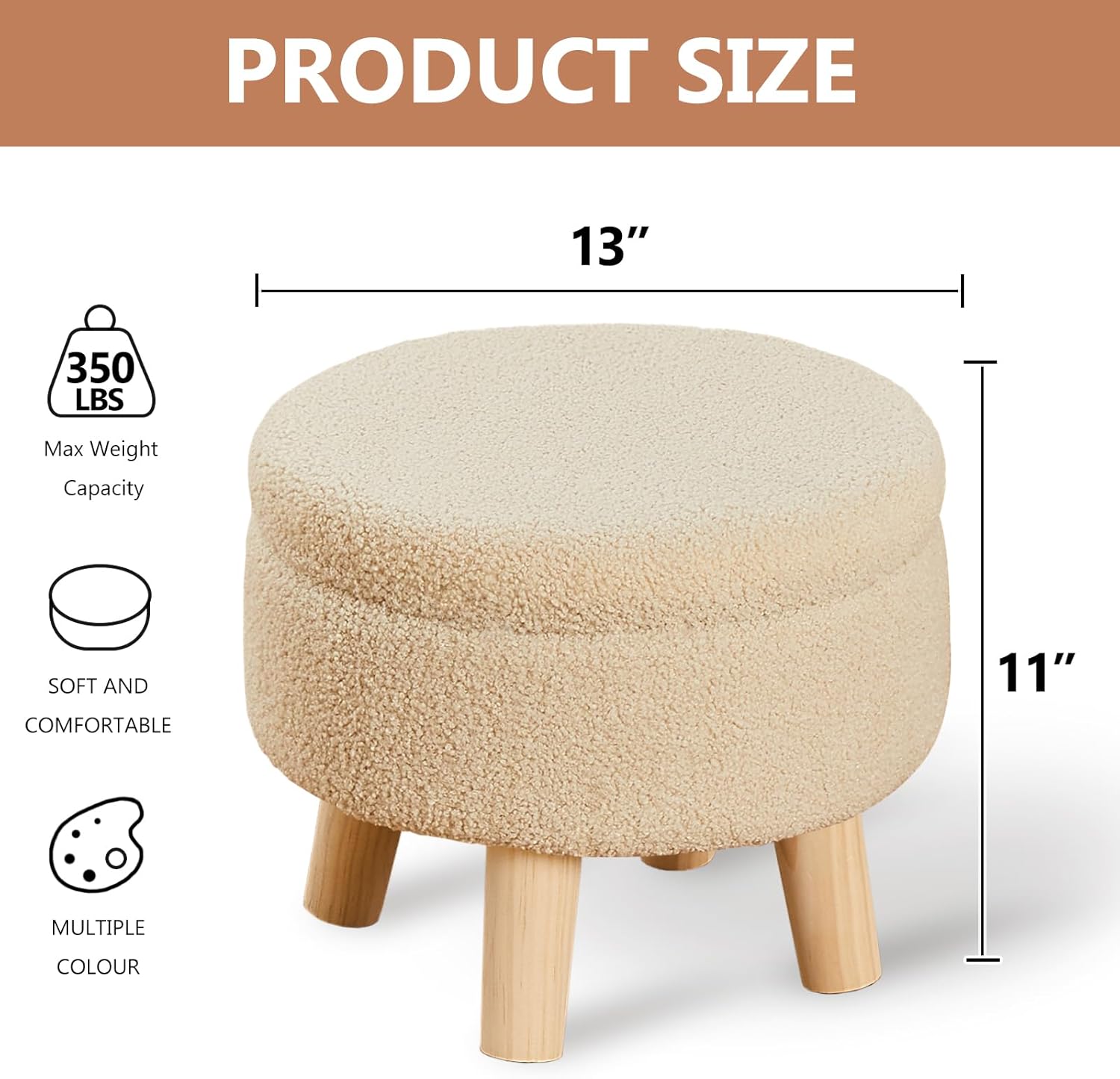 Wimarsbon Storage Ottoman, Modern Round Footrest with Soft Padded Seat, Teddy Velvet Footstool with Wood Legs, Accent Small Table or Plant Stand for Hallway, Living Room (Off-White)