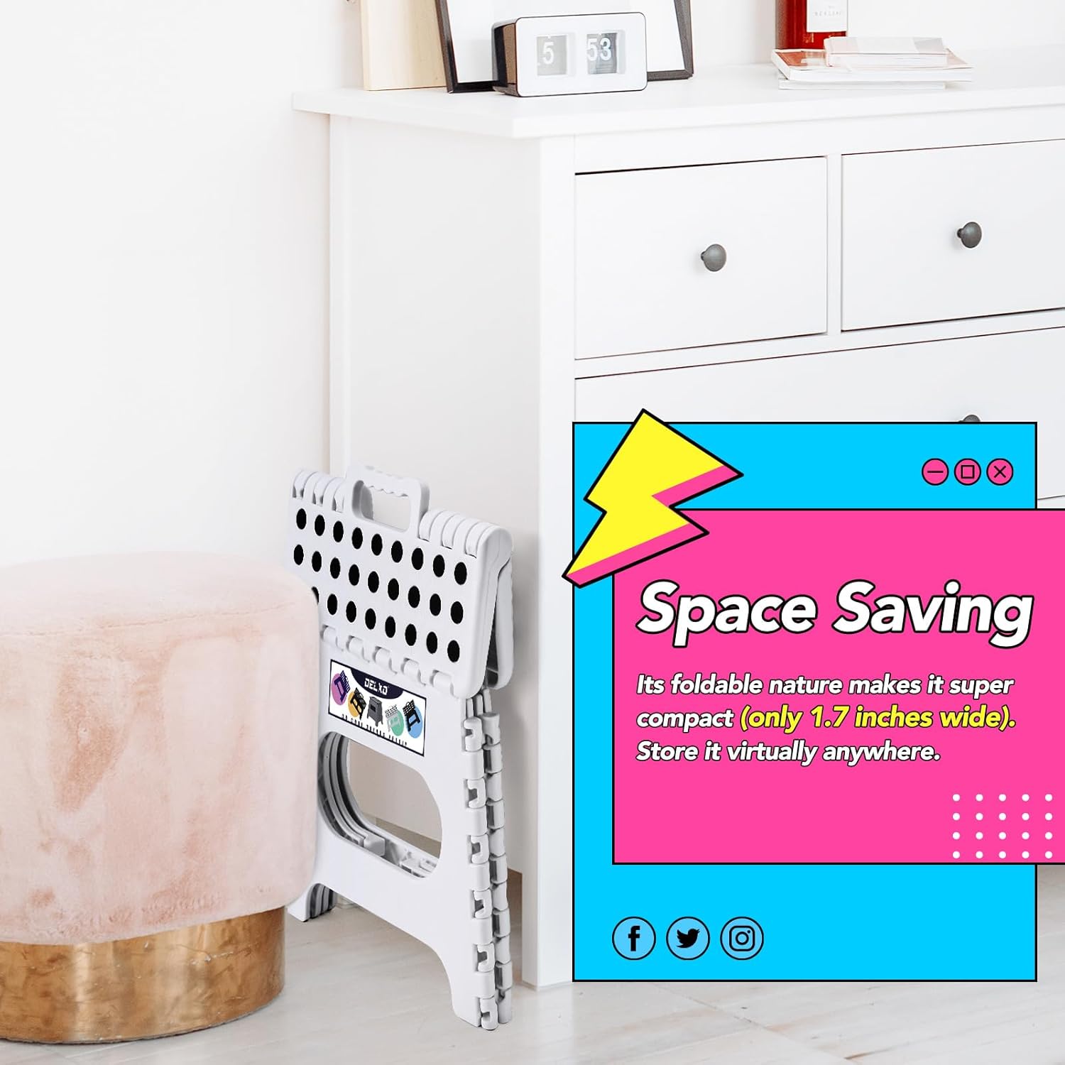 - Space Saving Foldable Stool : Delxo step stool save your closet space more than 90% when it folded up.It's quickly and easily folds away for convenient storage so you can opens with one flip of the hand.Also you can hides them in corner at home because it's so compact.